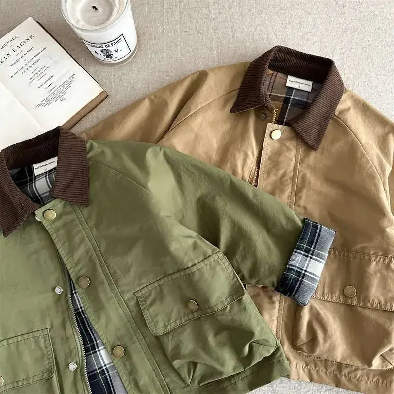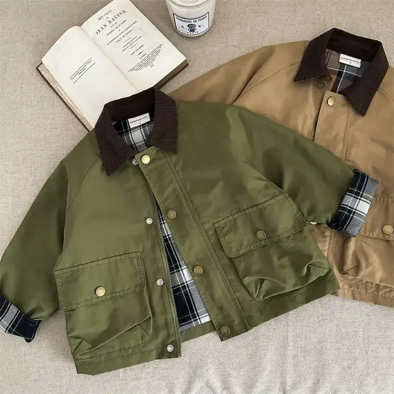 2025 Spring Autumn Kids Boys Jacket Plaid Spliced Pocket Long Sleeve Toddler Boys Outerwears Coat Children Boys Jacket