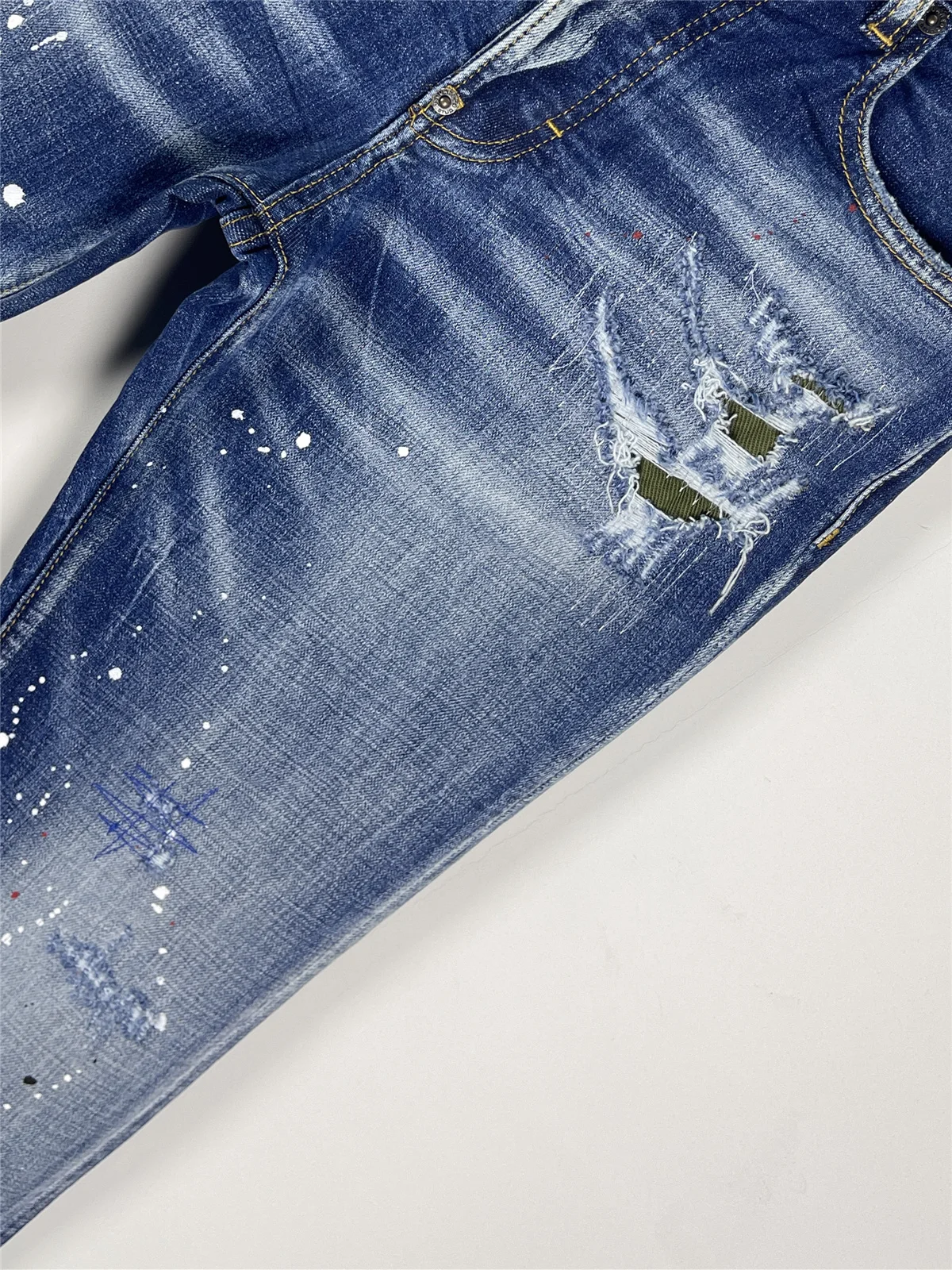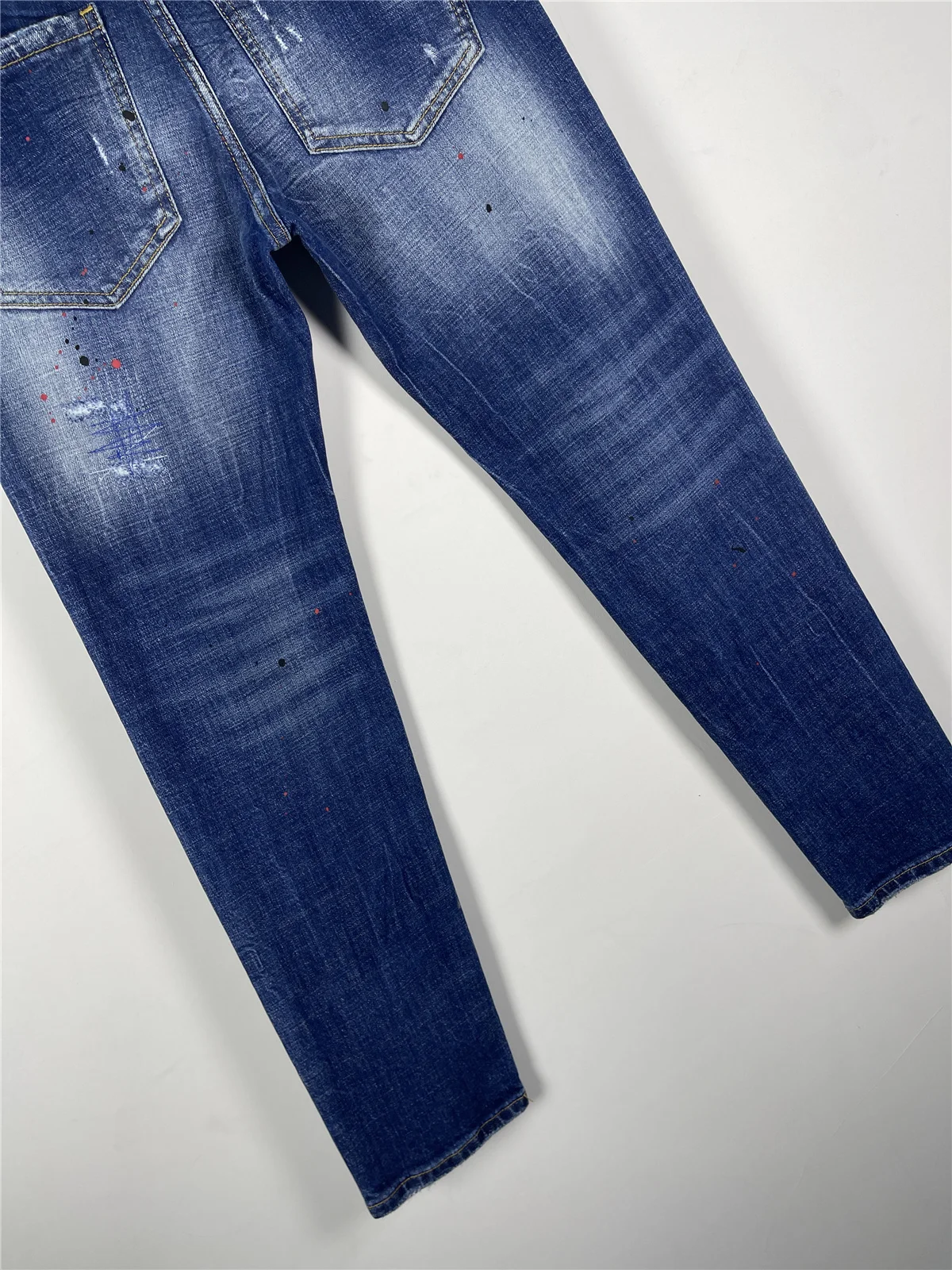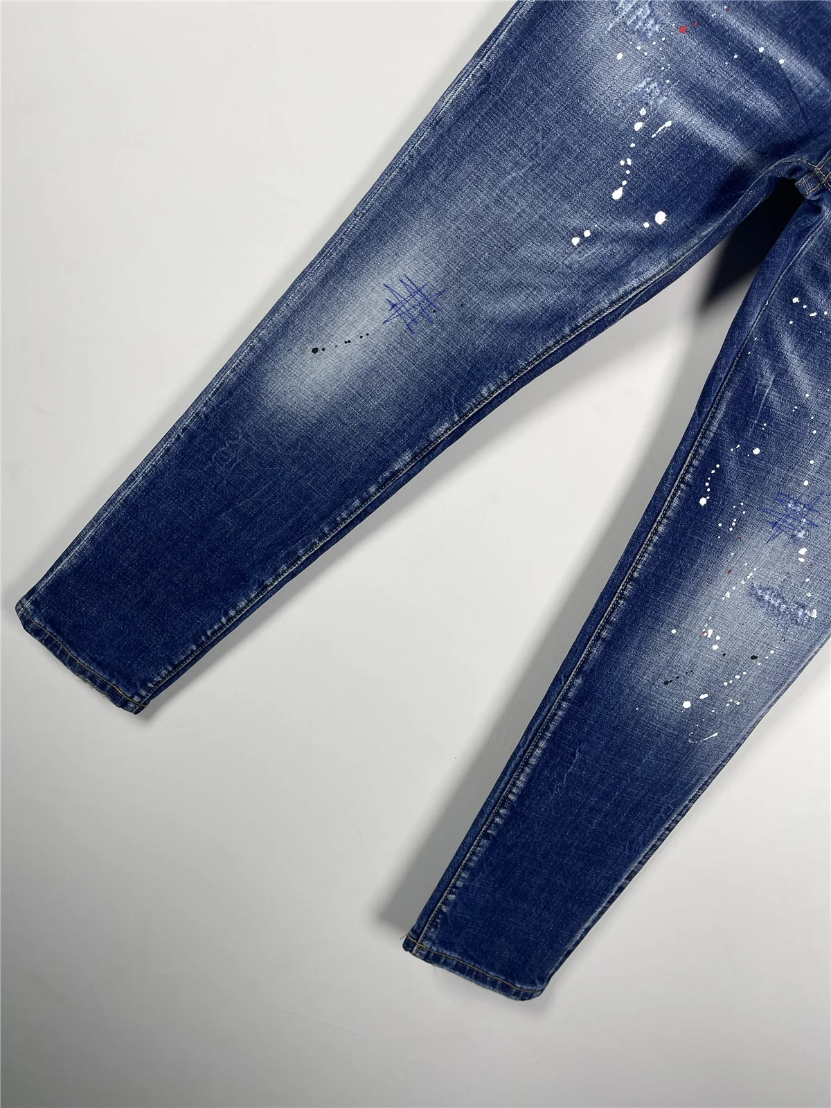 2025 Spring/Summer New D2 Jeans for Men, Washed, Scratched, Patched, Painted, Three Dimensional Cutting, Small Feet, Blue