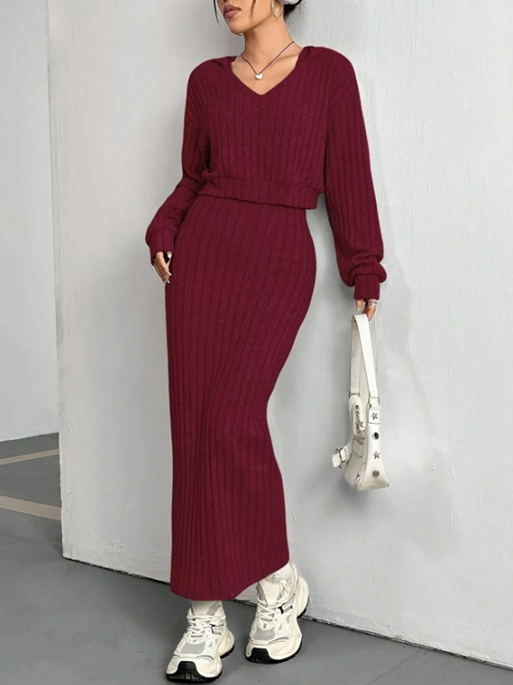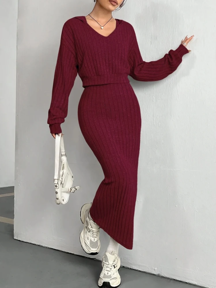 2-Piece Red Knitted Hooded Sweater Set for Women
