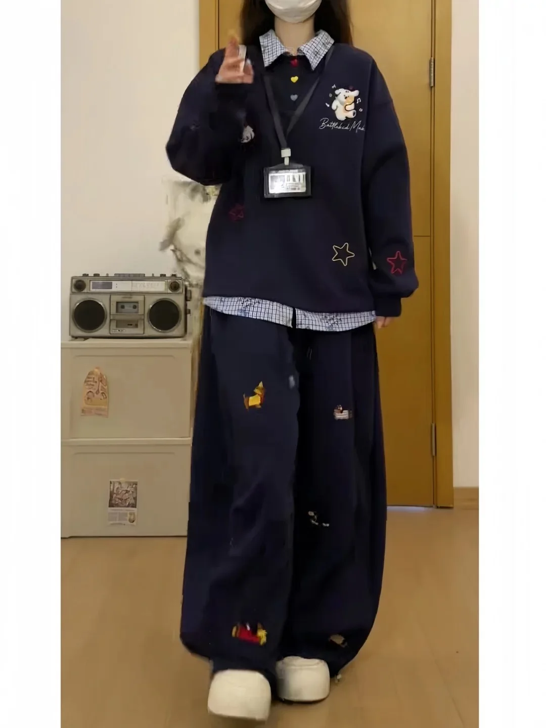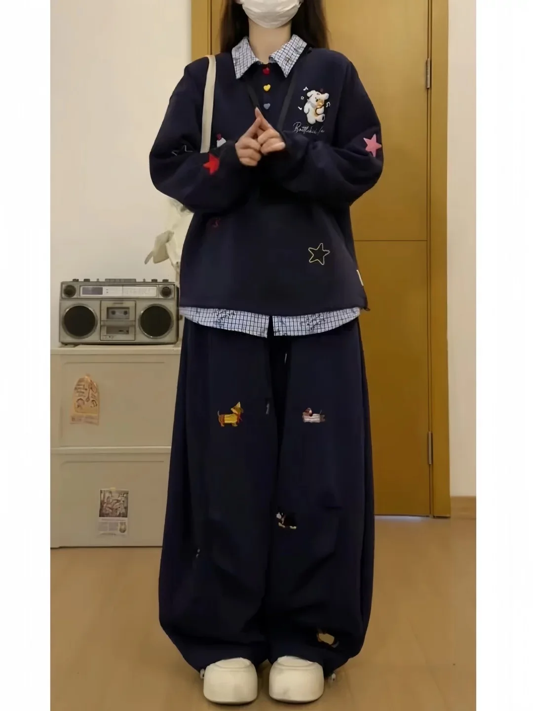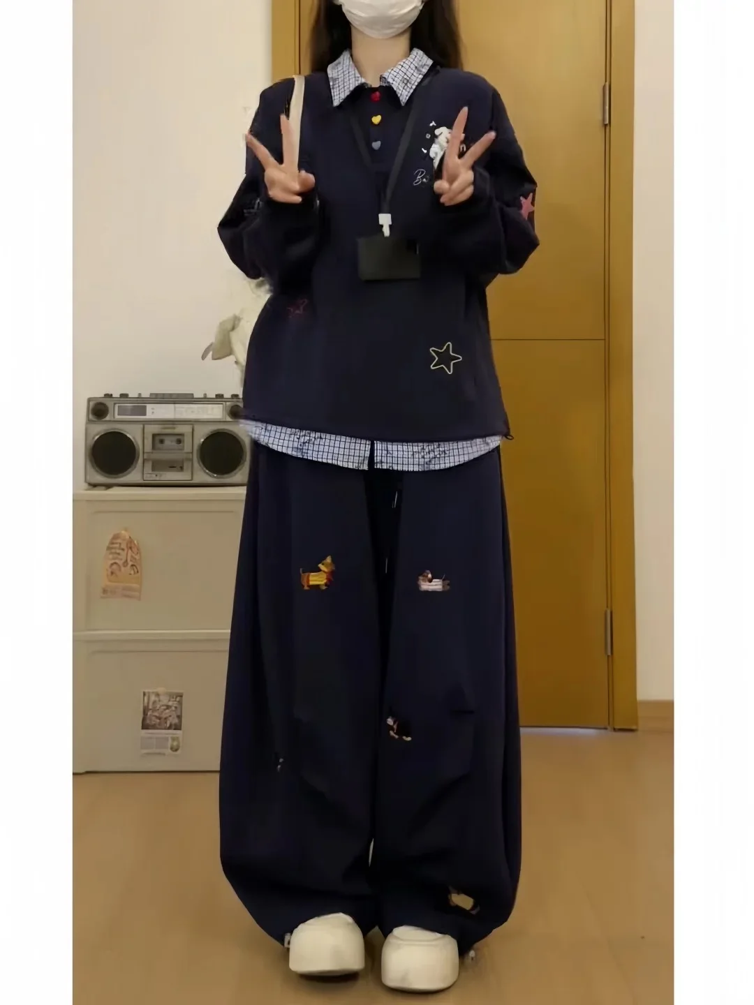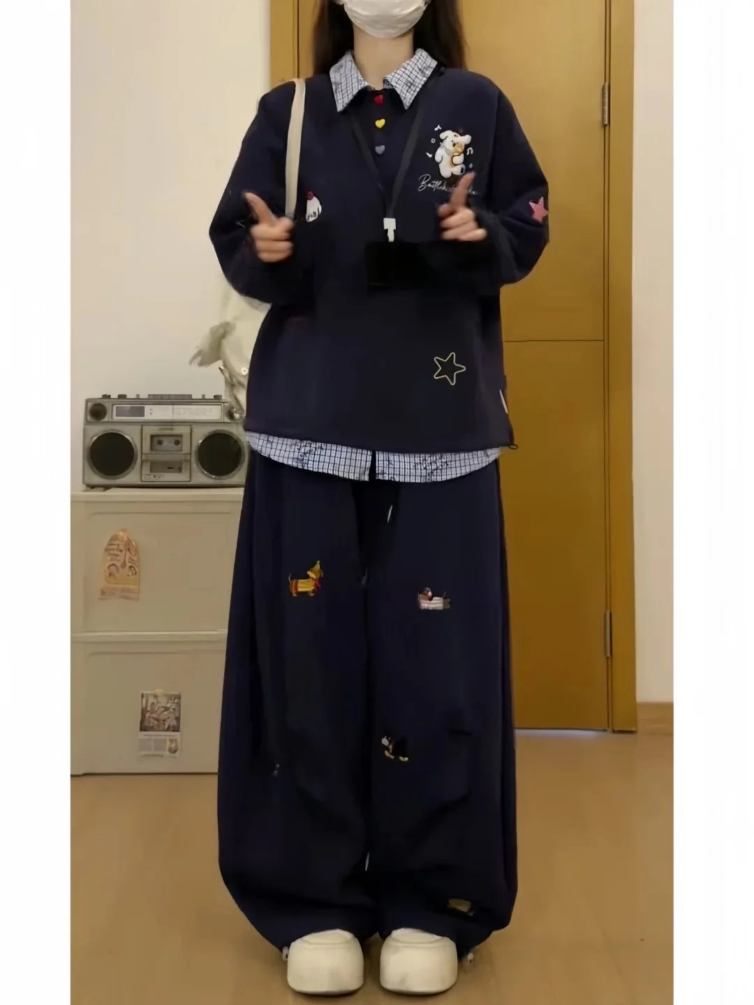 American Retro Style Embroidered Dog Polo Collar Faux Two-Piece Set for Women, New Loose Fit Slimming College Style Couple Sweatshirt and Pants Two-Piece Set