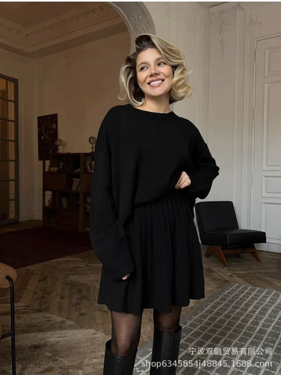 Autumn Solid Color O-Neck Sweater Dress Sets for Women — 2024 Knit Top & Short Skirt Set