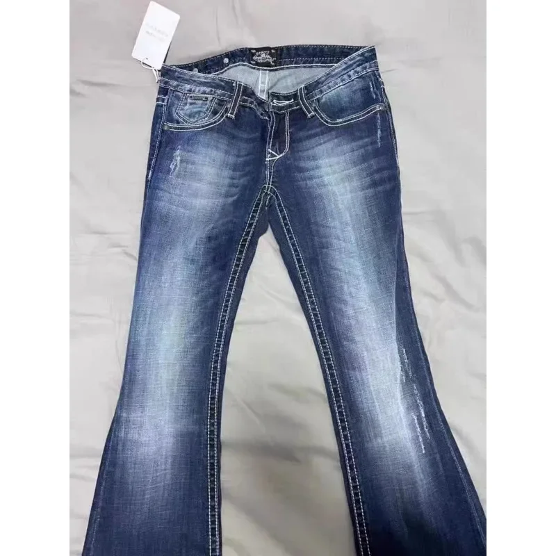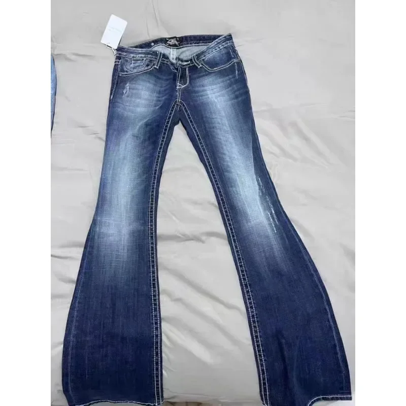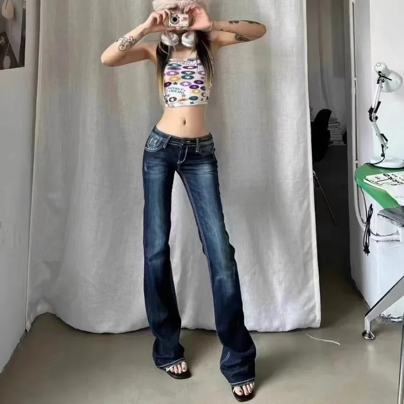 Blue Low Rise Flare Jeans Vintage 2000s Slim-fitting Denim Pants Korean Style Women Trousers y 2 k Distressed Mom 90s