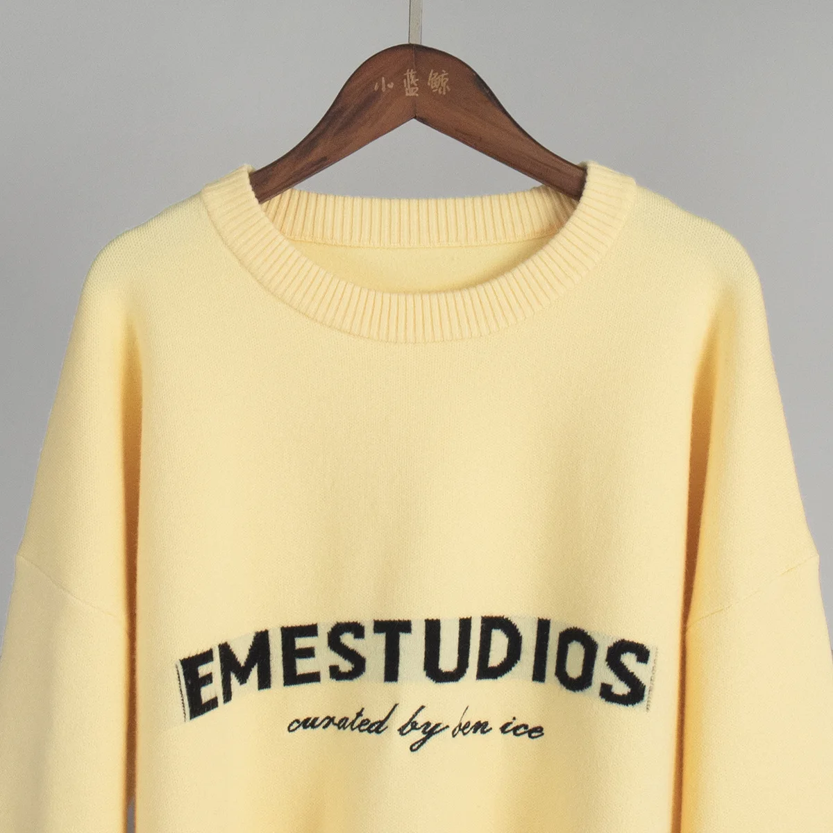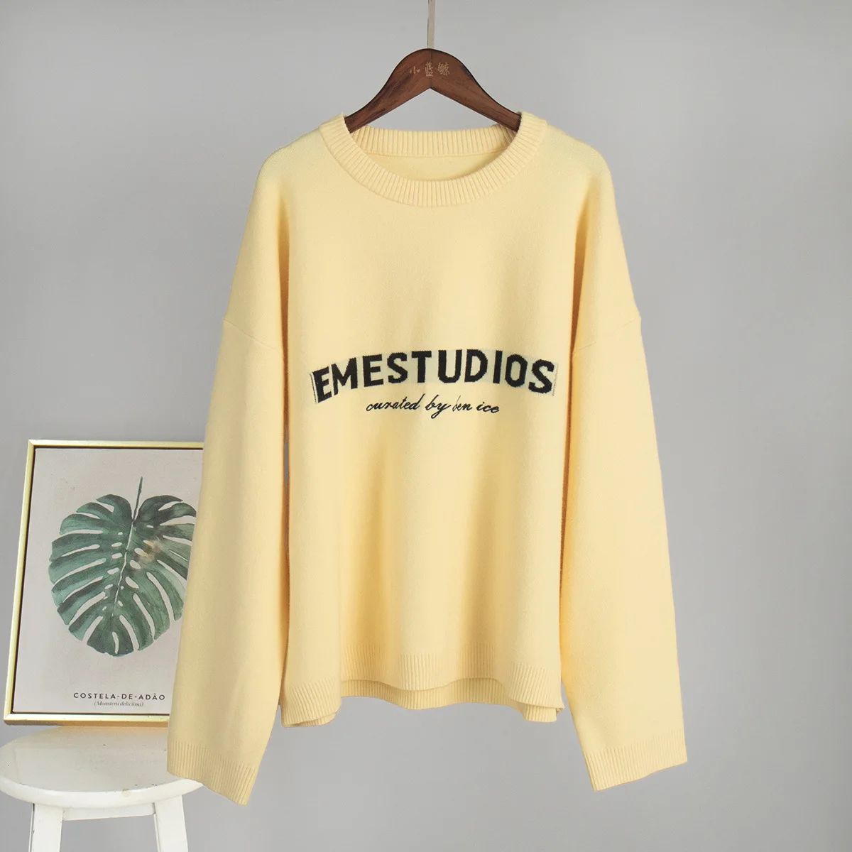 Butter Yellow Letters Knitted Sweater For Women Casual O-Neck Long Sleeve Pullover Tops 2025 Winter Daily Street Loose Sweaters