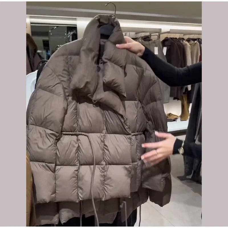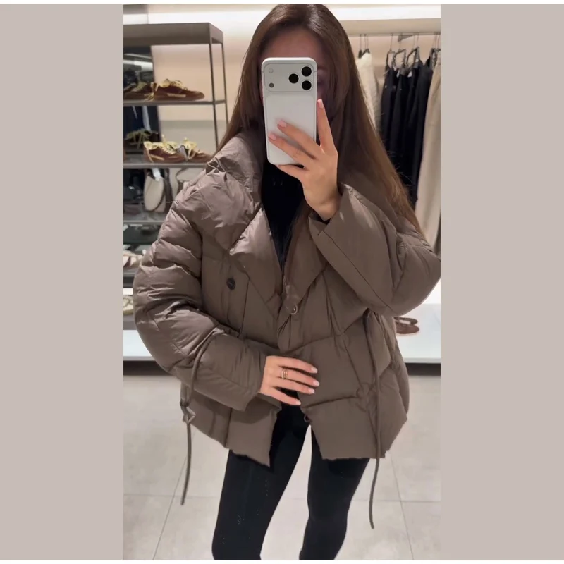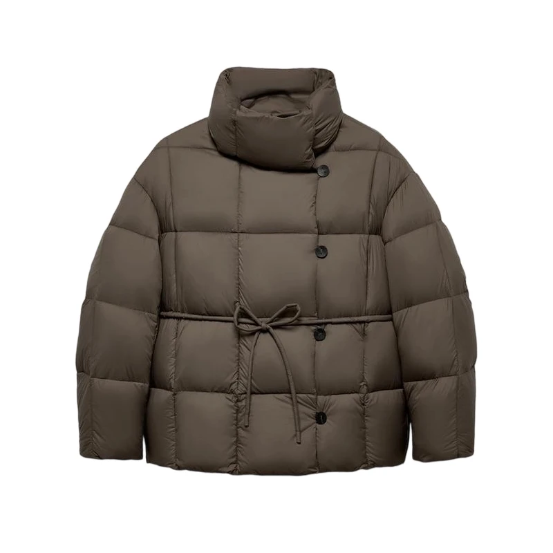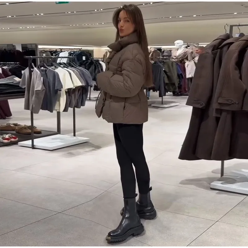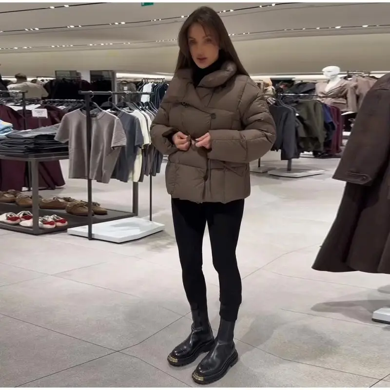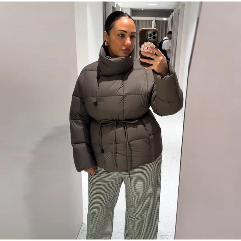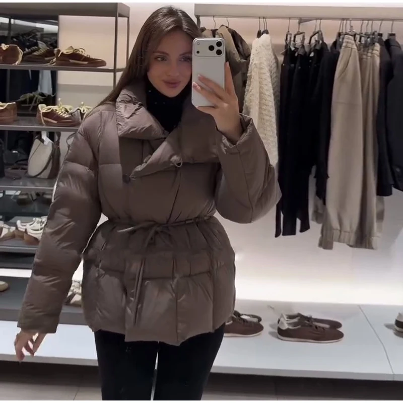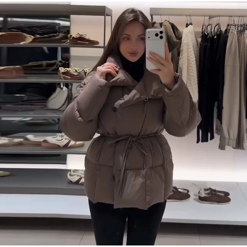 Buttoned Tie-Waist Stand Collar Puffer Jacket Solid Long Sleeve 2025 Winter Cozy Warm Women Outerwear Chic Casual Lady Coat