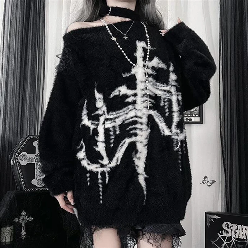 Dark Punk Sweater Women Harajuku Y2K Long Sleeve Knit Pullover Black Gothic Street Loose Top American Vintage Lazy Knitwear