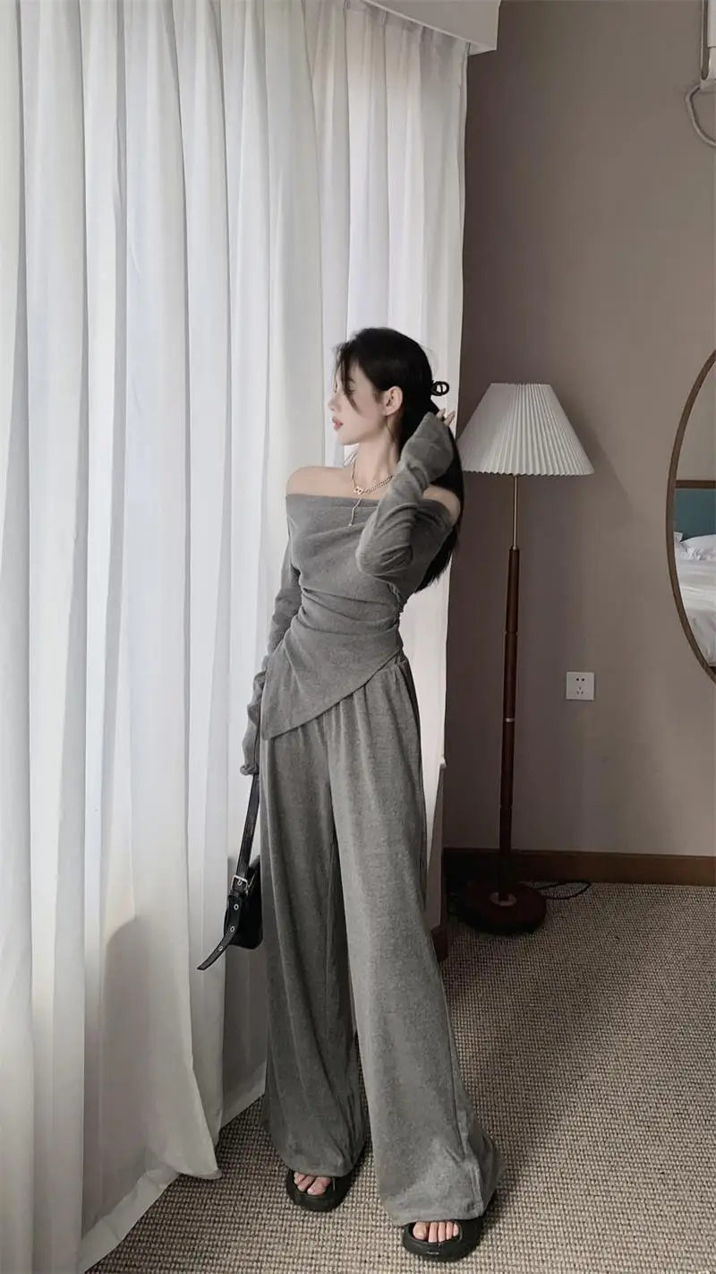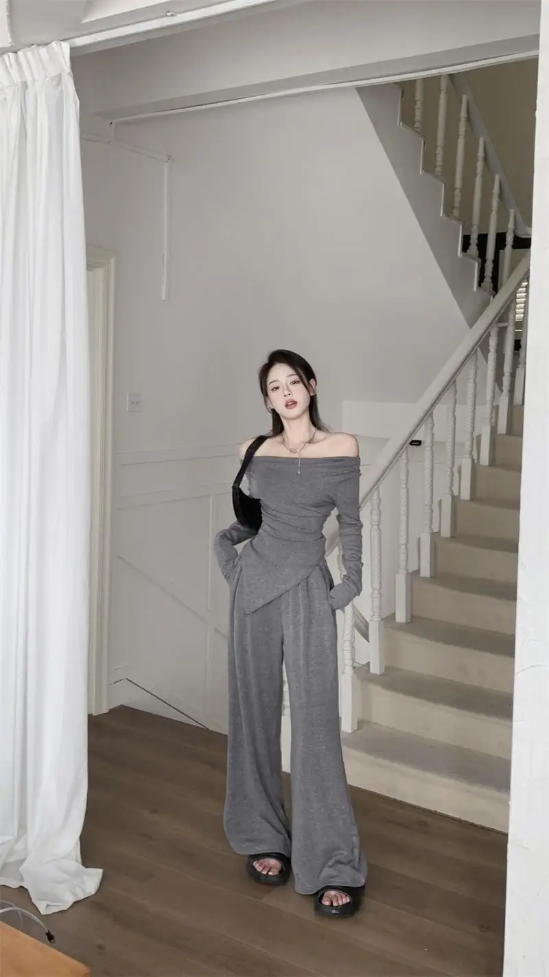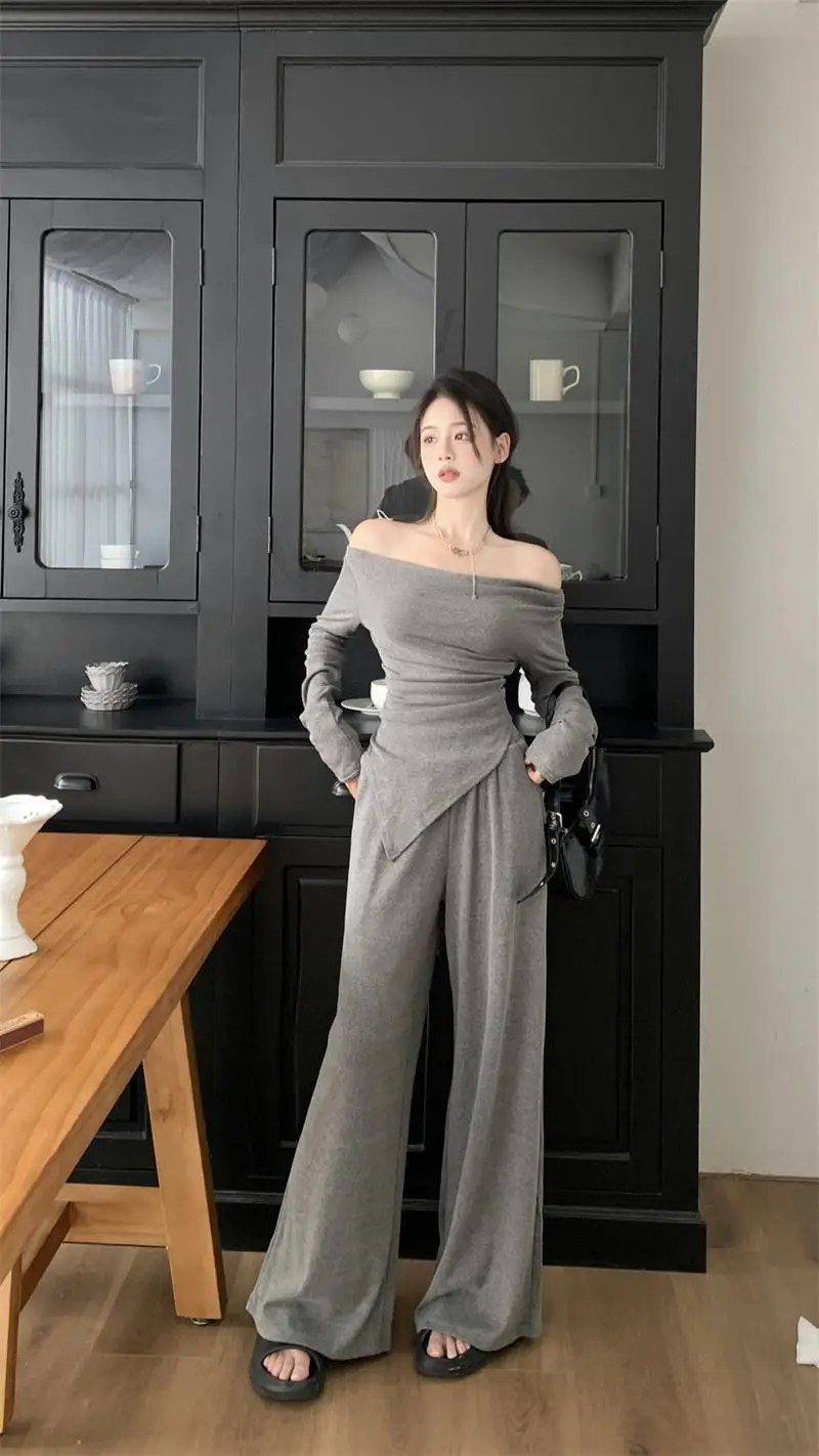 Featuring a chic one-shoulder design and wide-leg pants, this set exudes elegance and sophistication, ideal for autumn and winter styling.