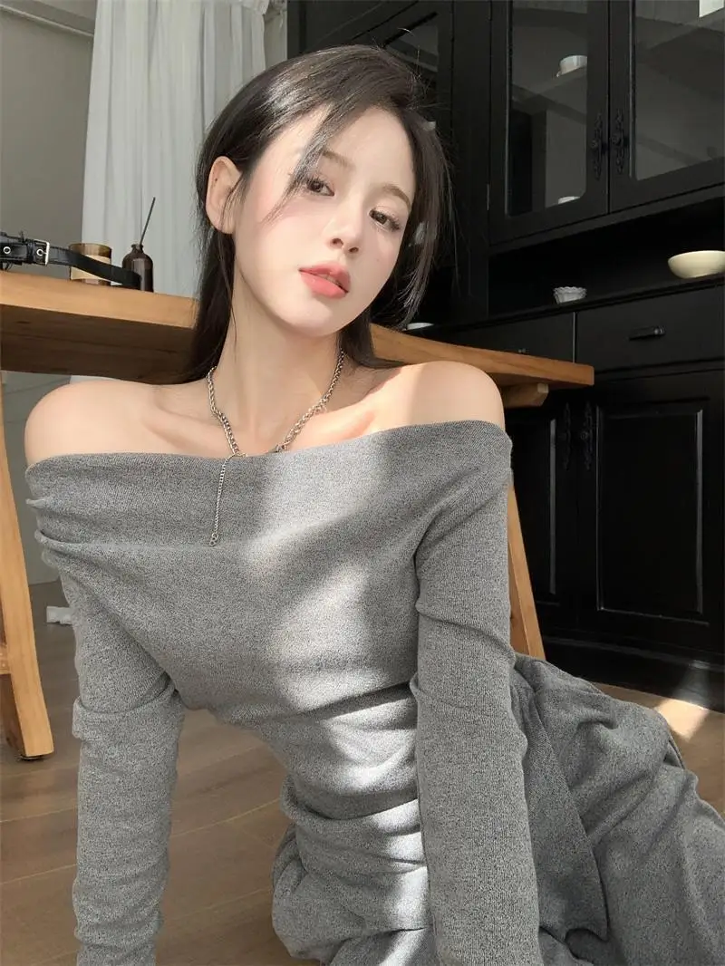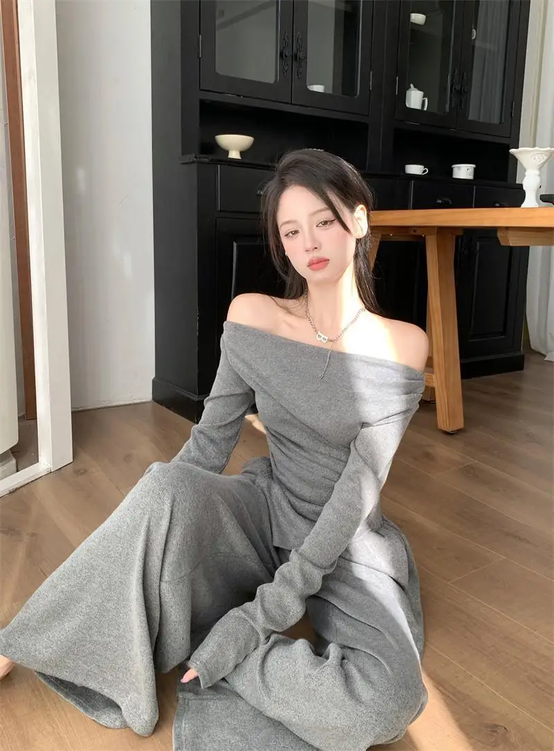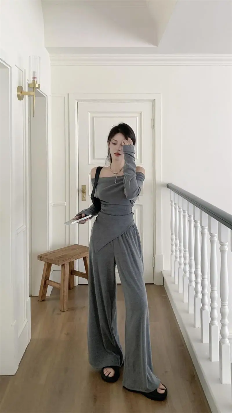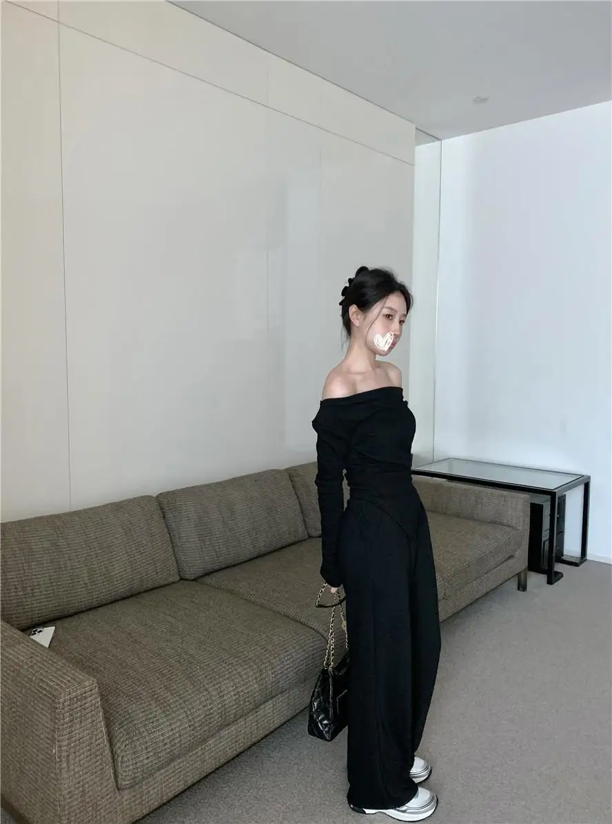 Featuring a chic one-shoulder design and wide-leg pants, this set exudes elegance and sophistication, ideal for autumn and winter styling.
