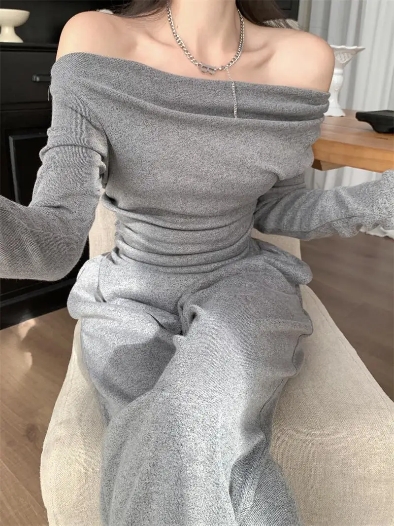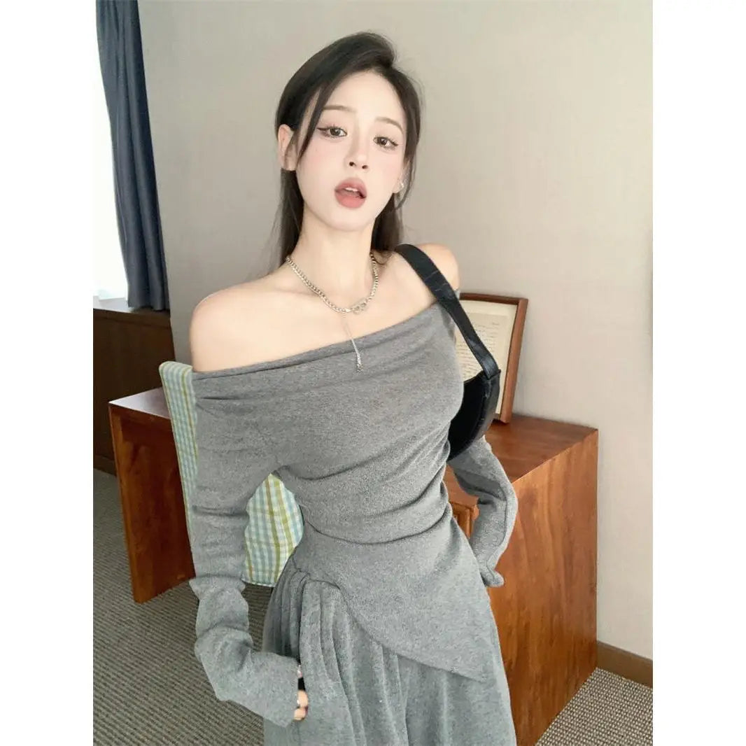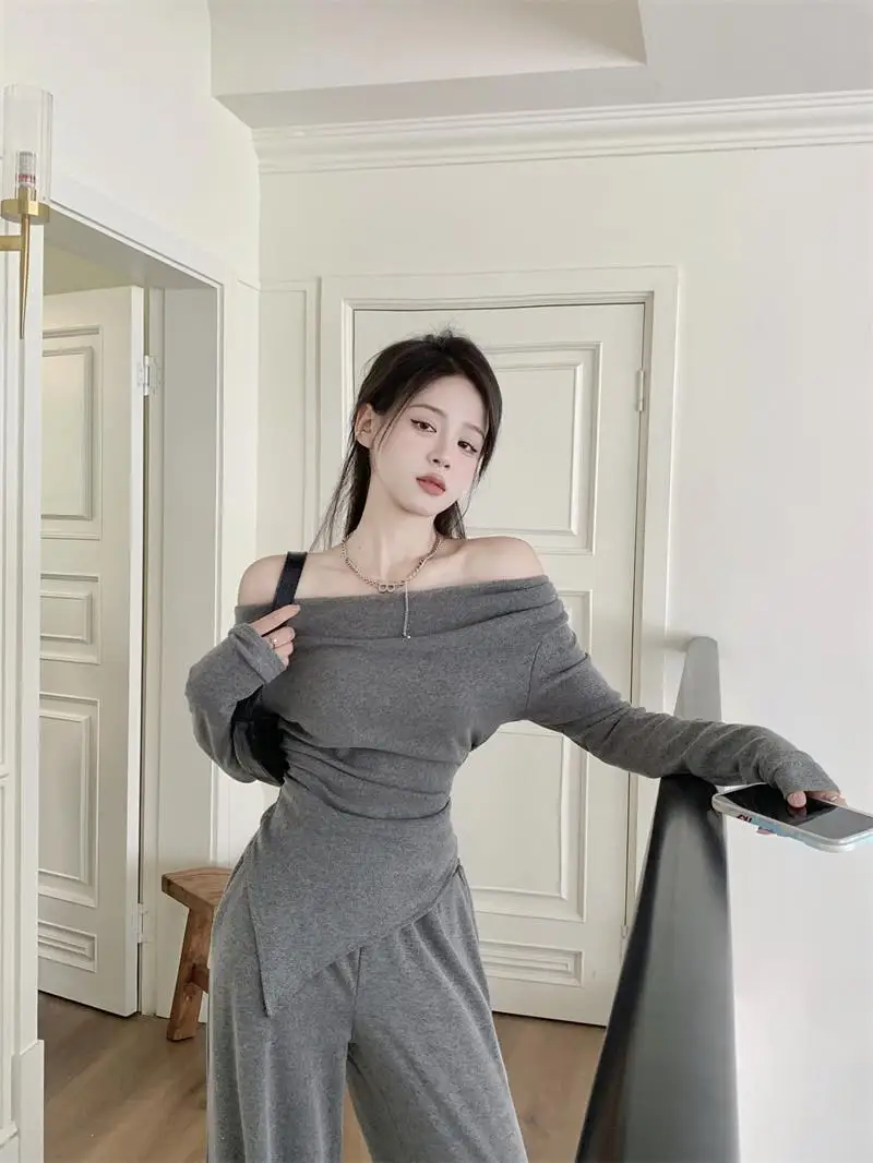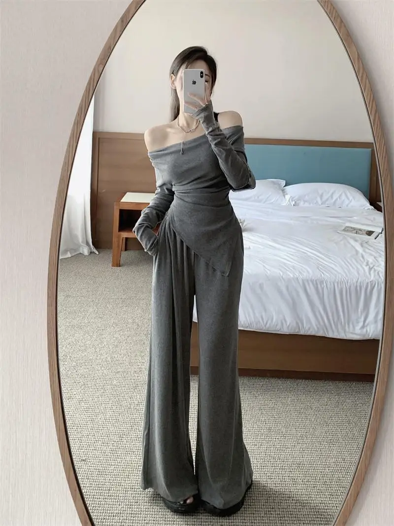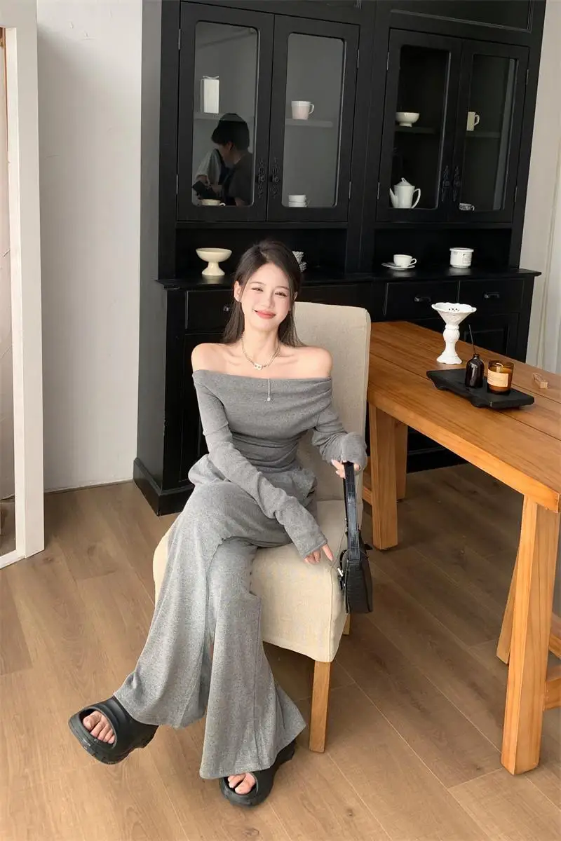 Elegant Two-Piece Set Women's Shoulder Bared Long Sleeve Top Wide Leg Pants Autumn Winter Fashion High Quality Polyester