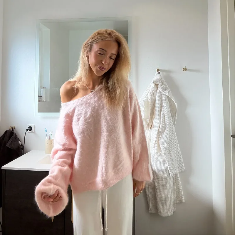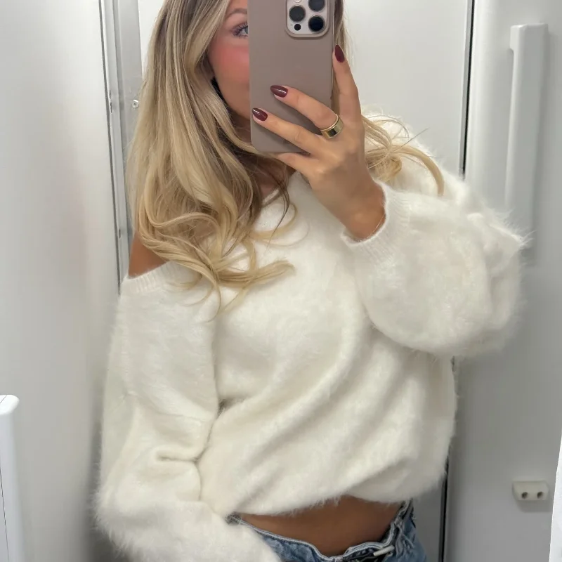 Fashion Women Off Shoulder Faux Wool Knitted Sweater Sexy Classic Full Sleeve Loose Fluffy Short Pullover Lady Daily Street Tops