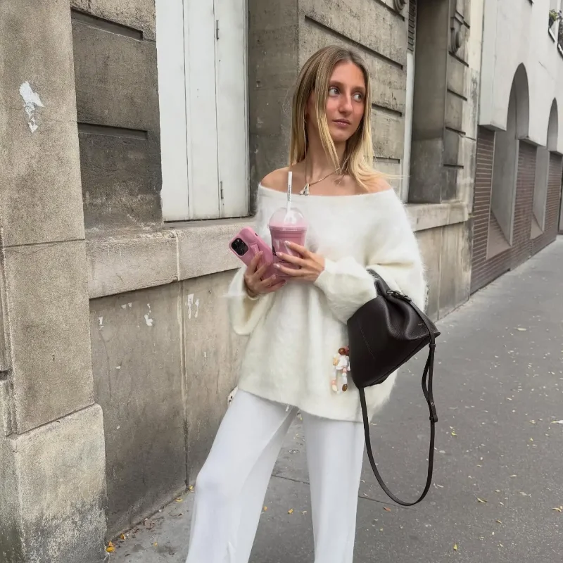Women Solid Off Shoulder Pullover Fashion Classic Full Sleeve Loose Knitted Sweater 2025 Lady New Daily High Street Autumn Tops