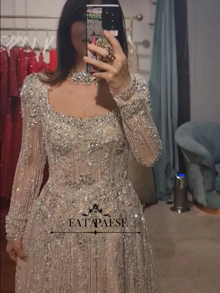 FATAPAESE Exquisite Stones Beads Haute Couture Evening Dresses Luxury Long Sleeve Prom Dresses for Wedding Party Arabic Dress