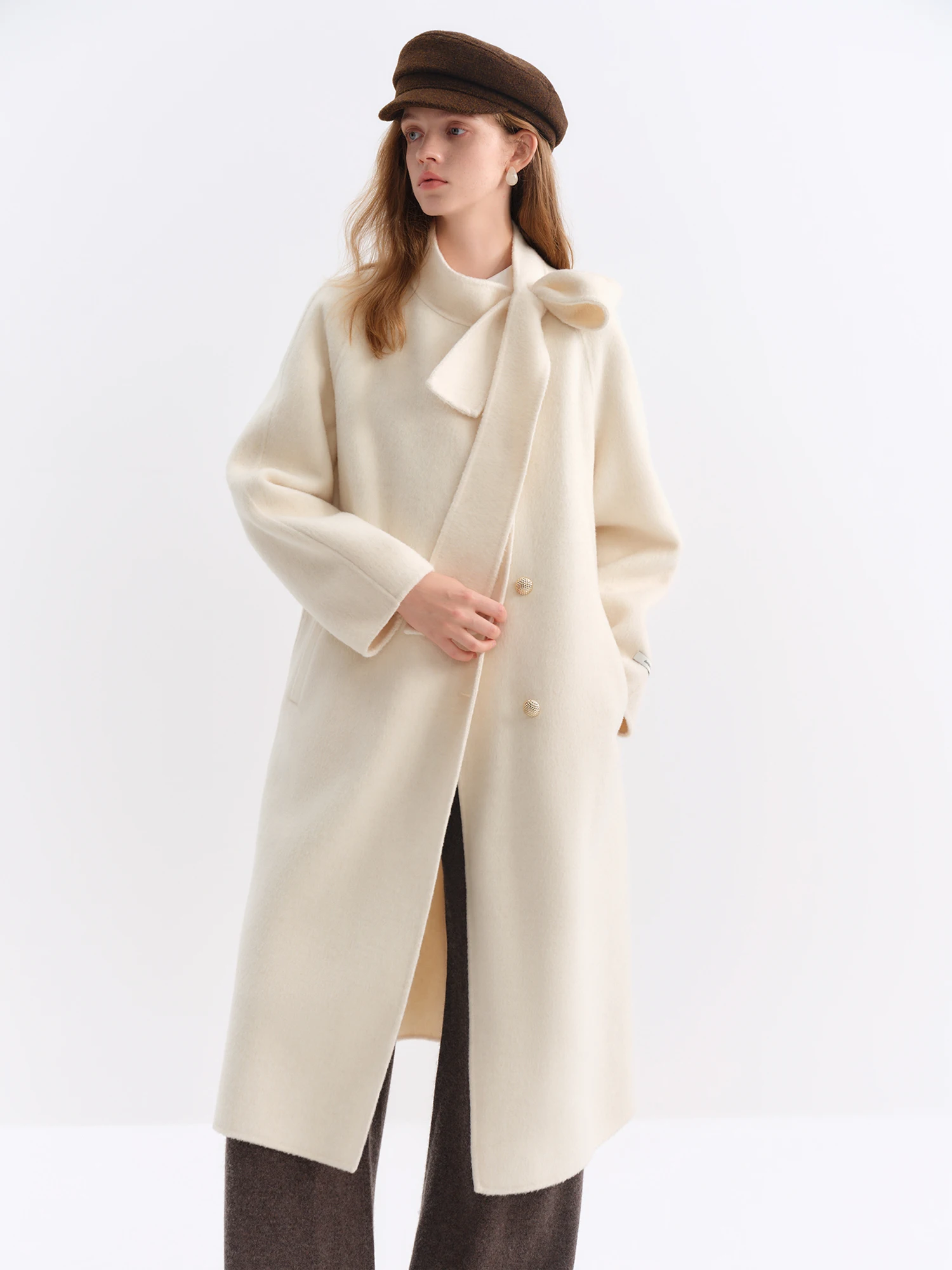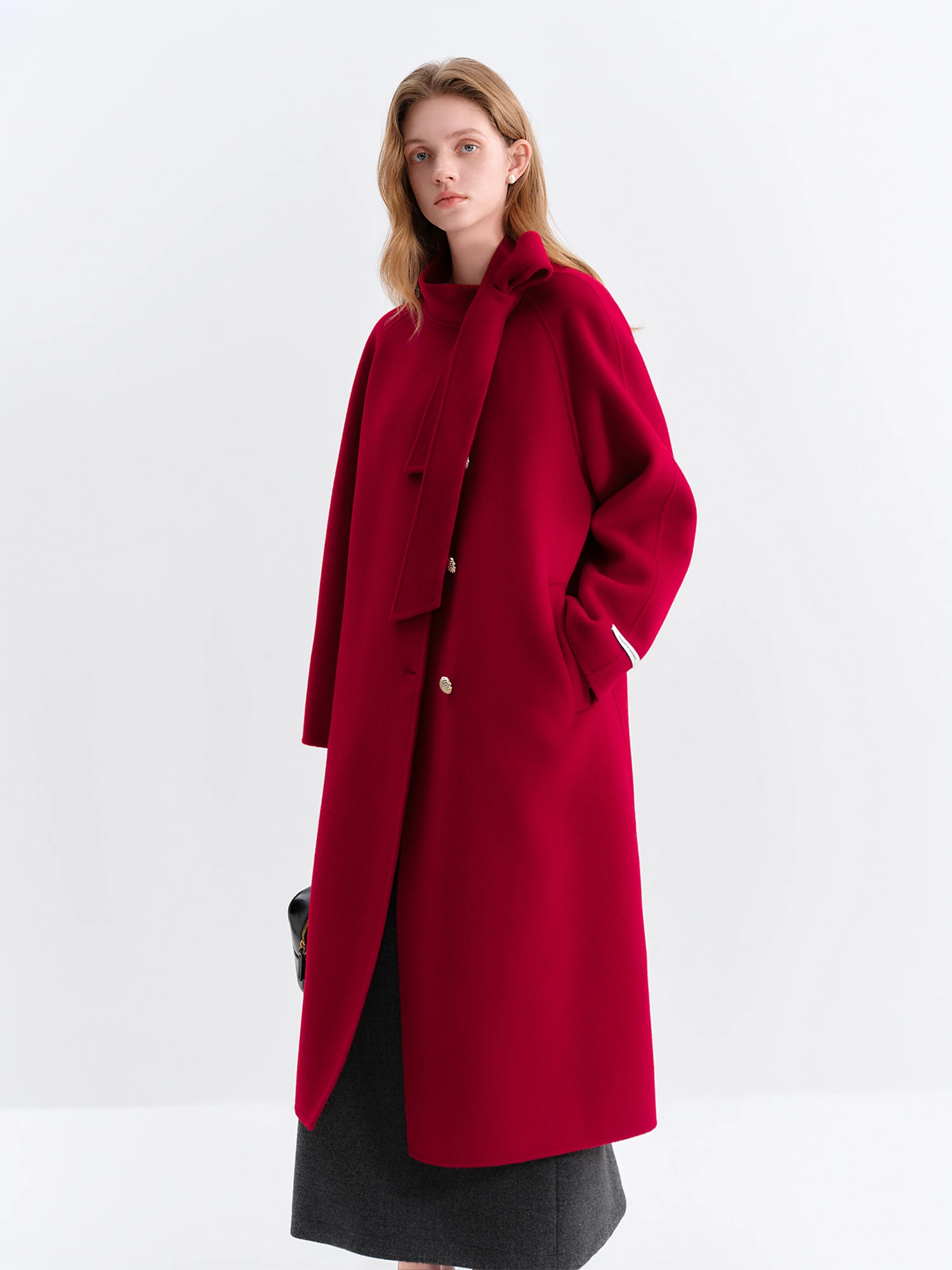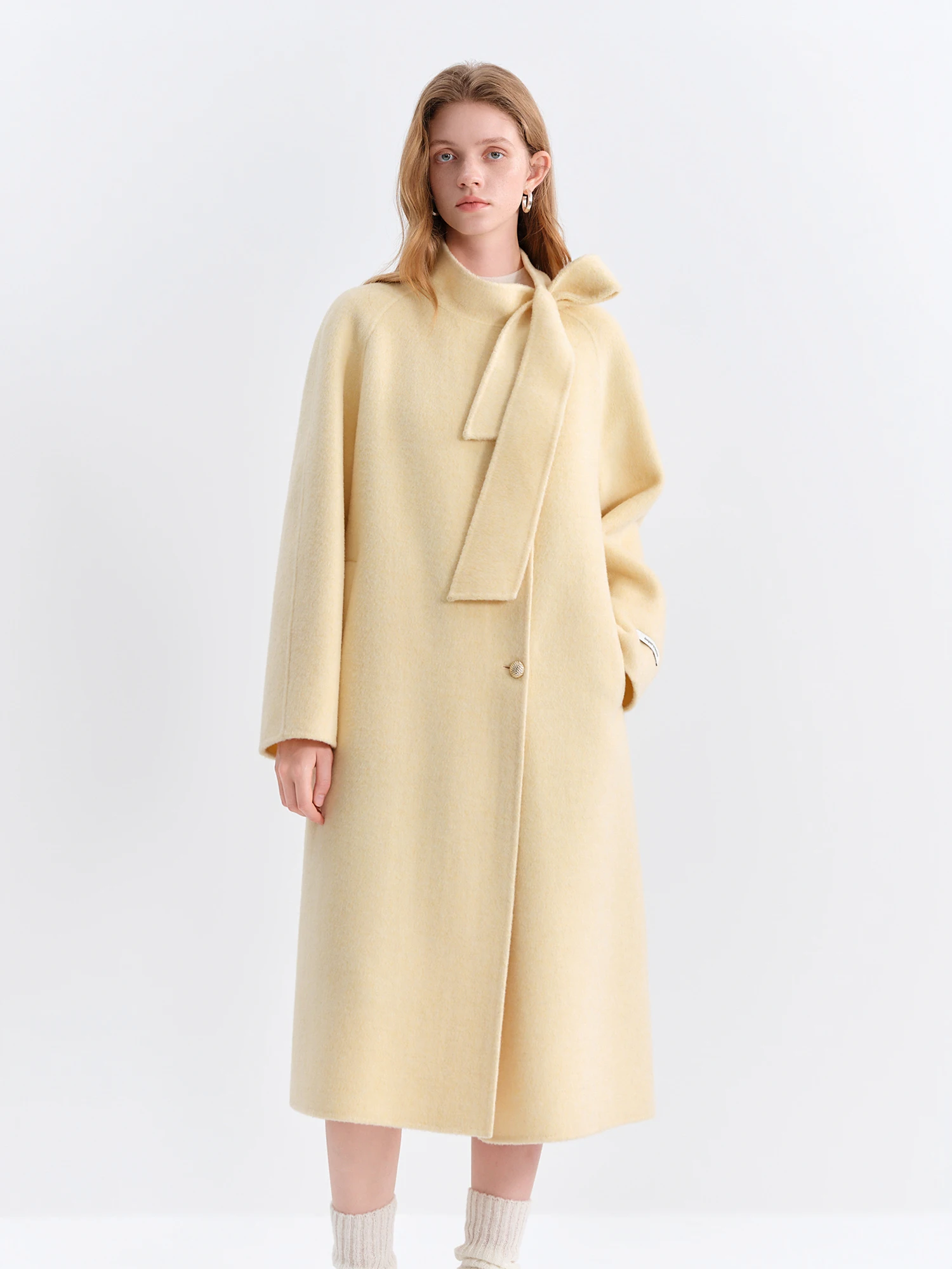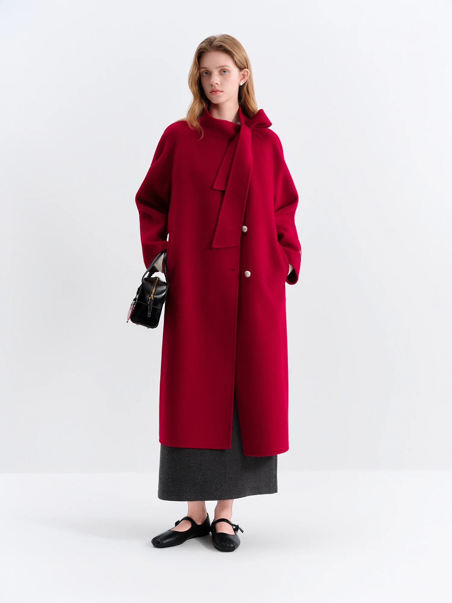 FSLE Winter 2025 Women Stand Collar Tie Detail Double Faced Wool Blend Coat - Long Length Elegant Outerwear for Casual Winter