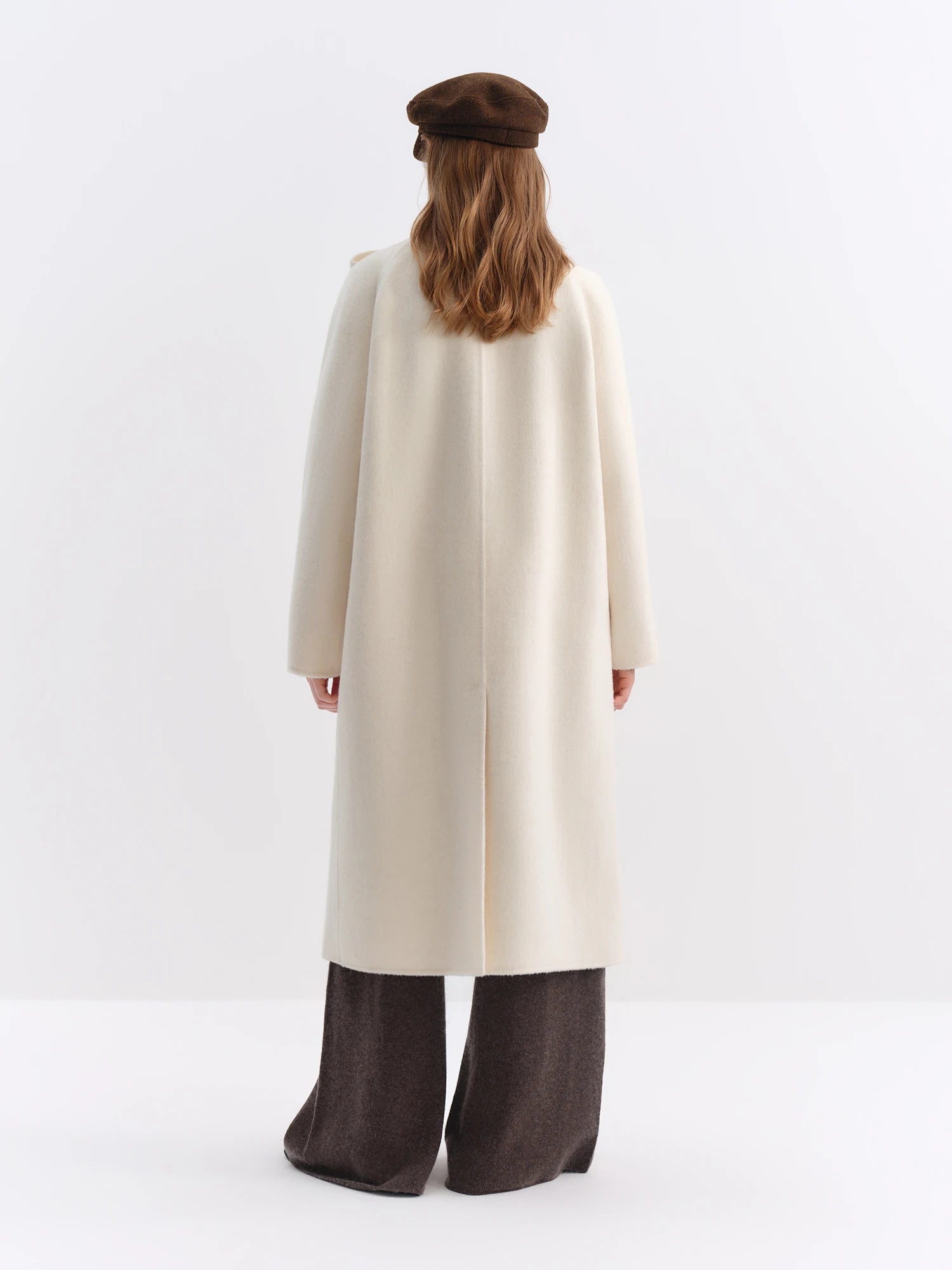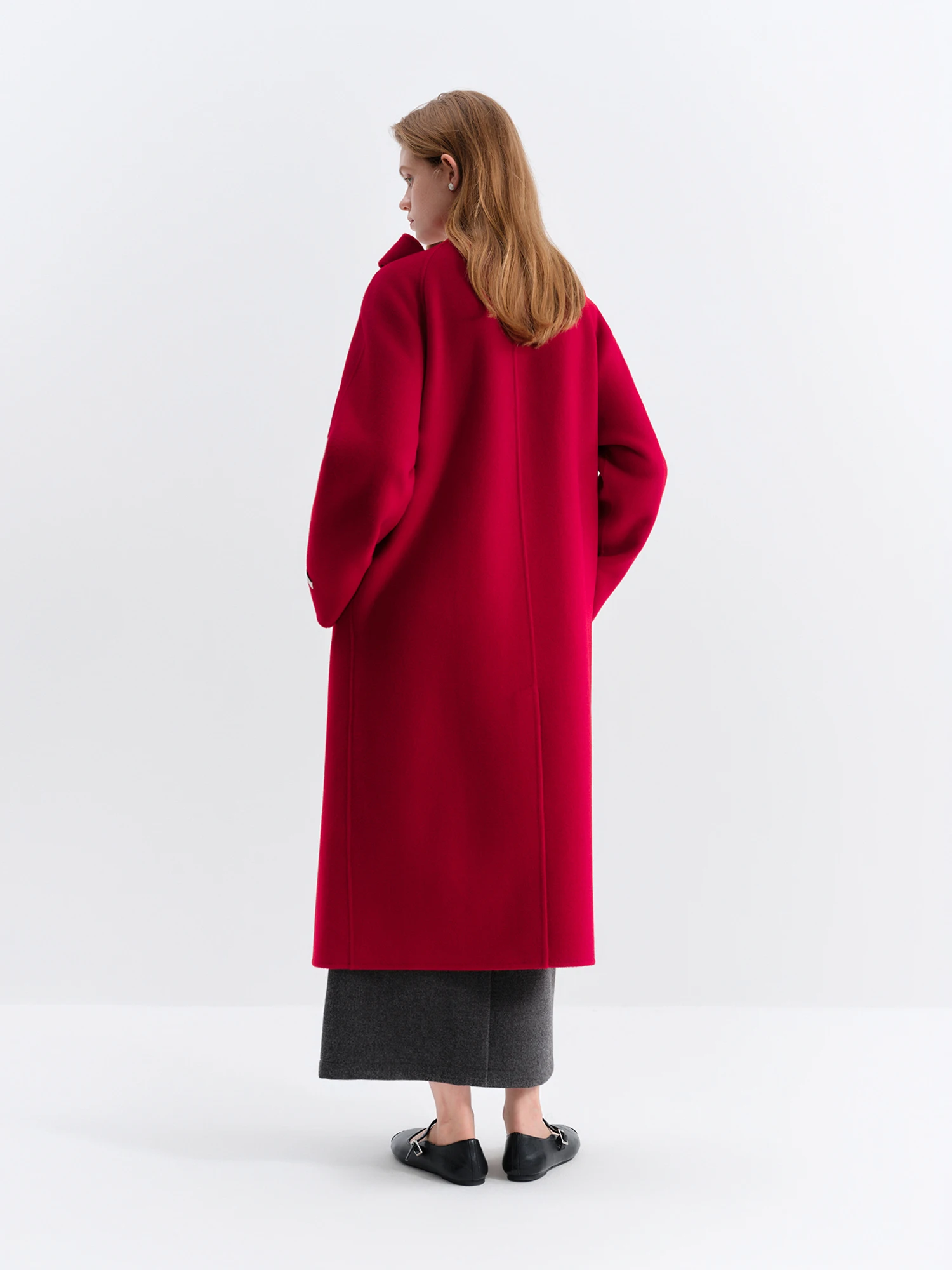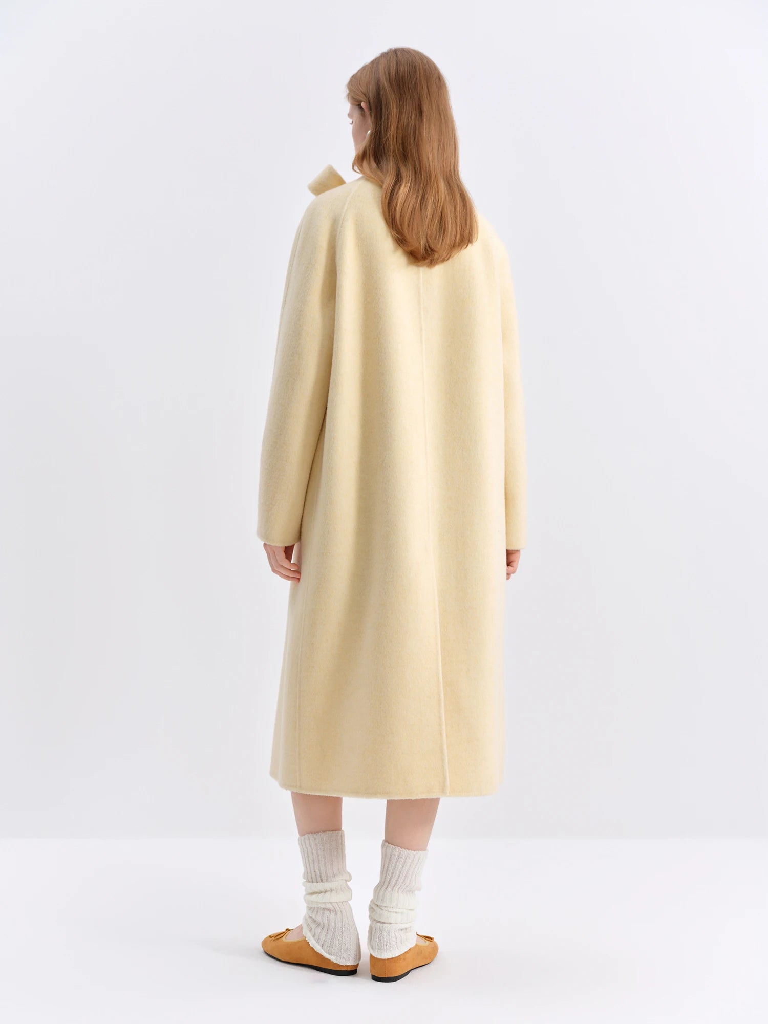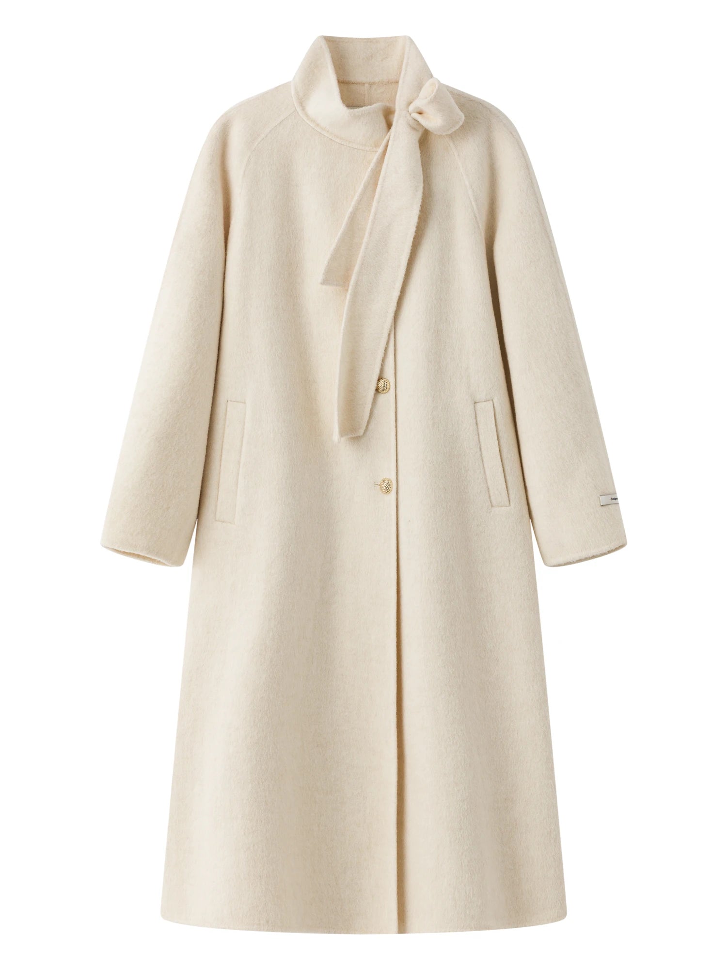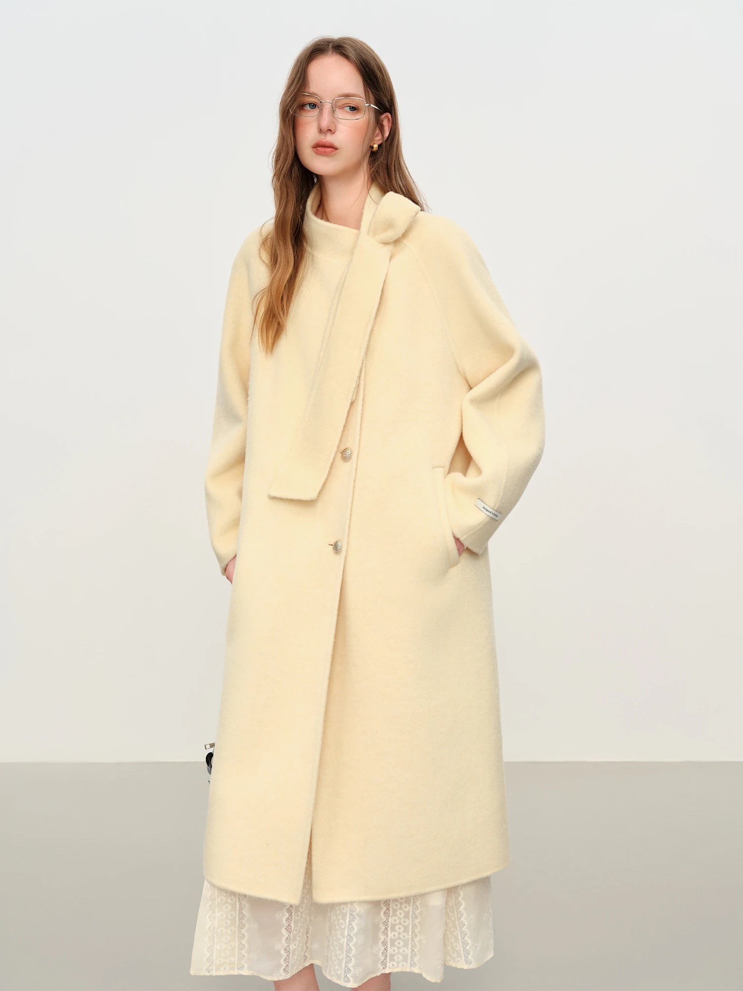 FSLE Winter 2025 Women Stand Collar Tie Detail Double Faced Wool Blend Coat - Long Length Elegant Outerwear for Casual Winter