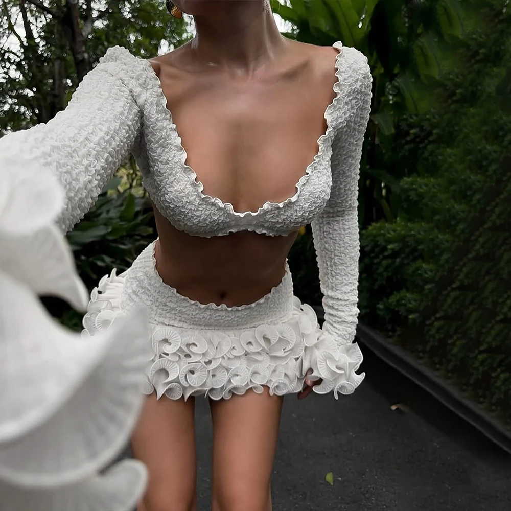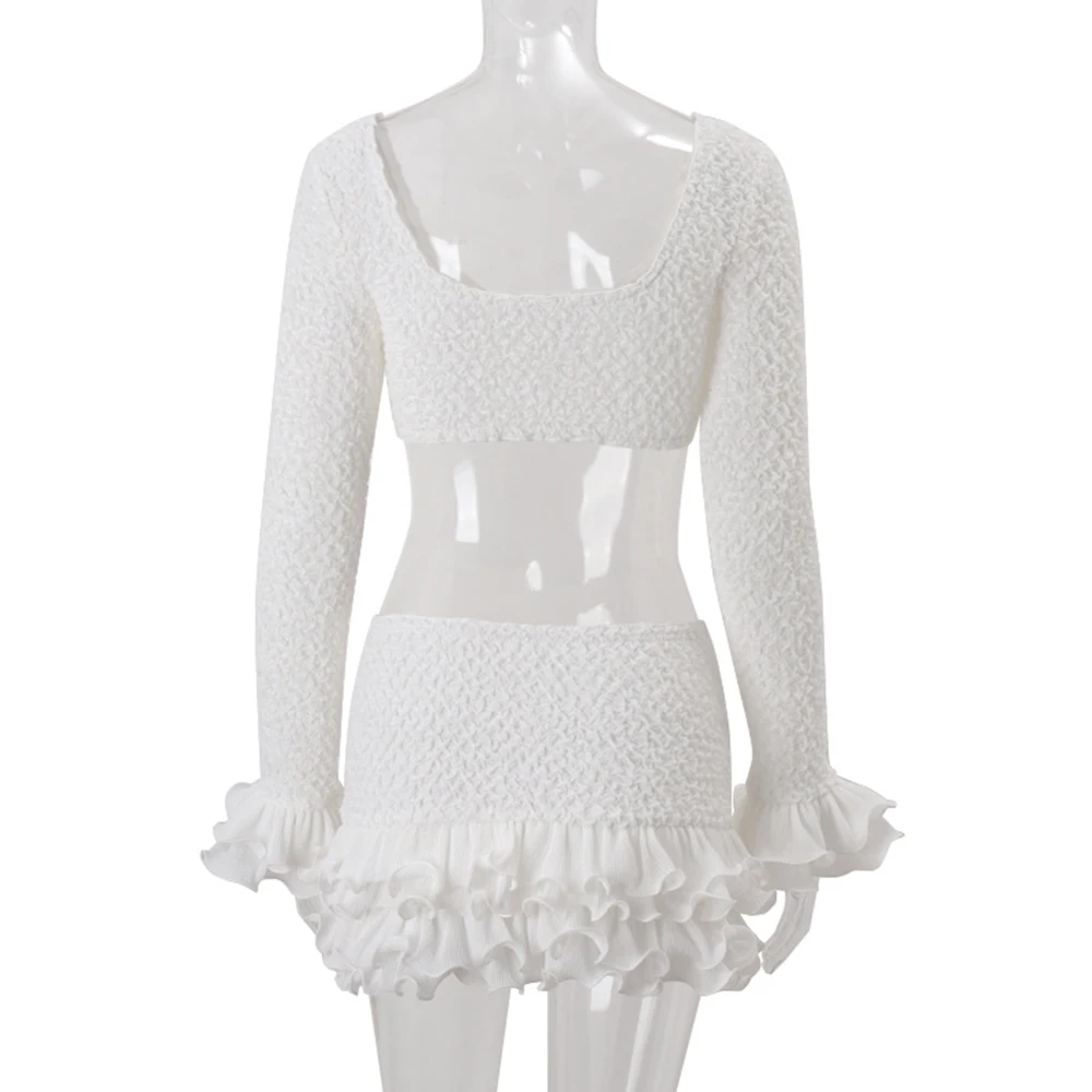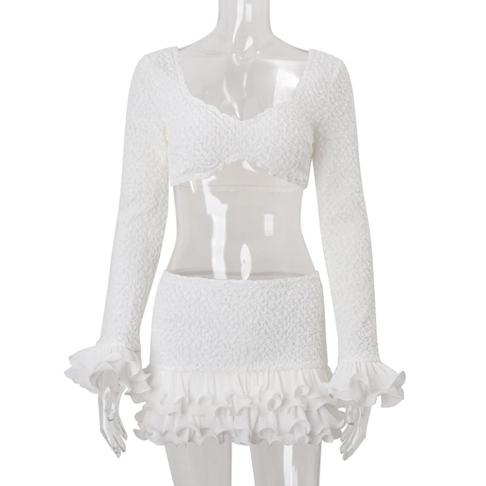Discover a bold, summery style with this two-piece set from FZCSPEED. Designed for women who want a chic, club-ready look, the white mini skirt set blends a strappy cardigan top with a ruffle-layered mini skirt for an effortless, confident vibe.
