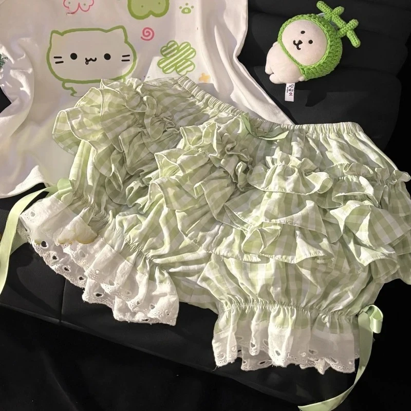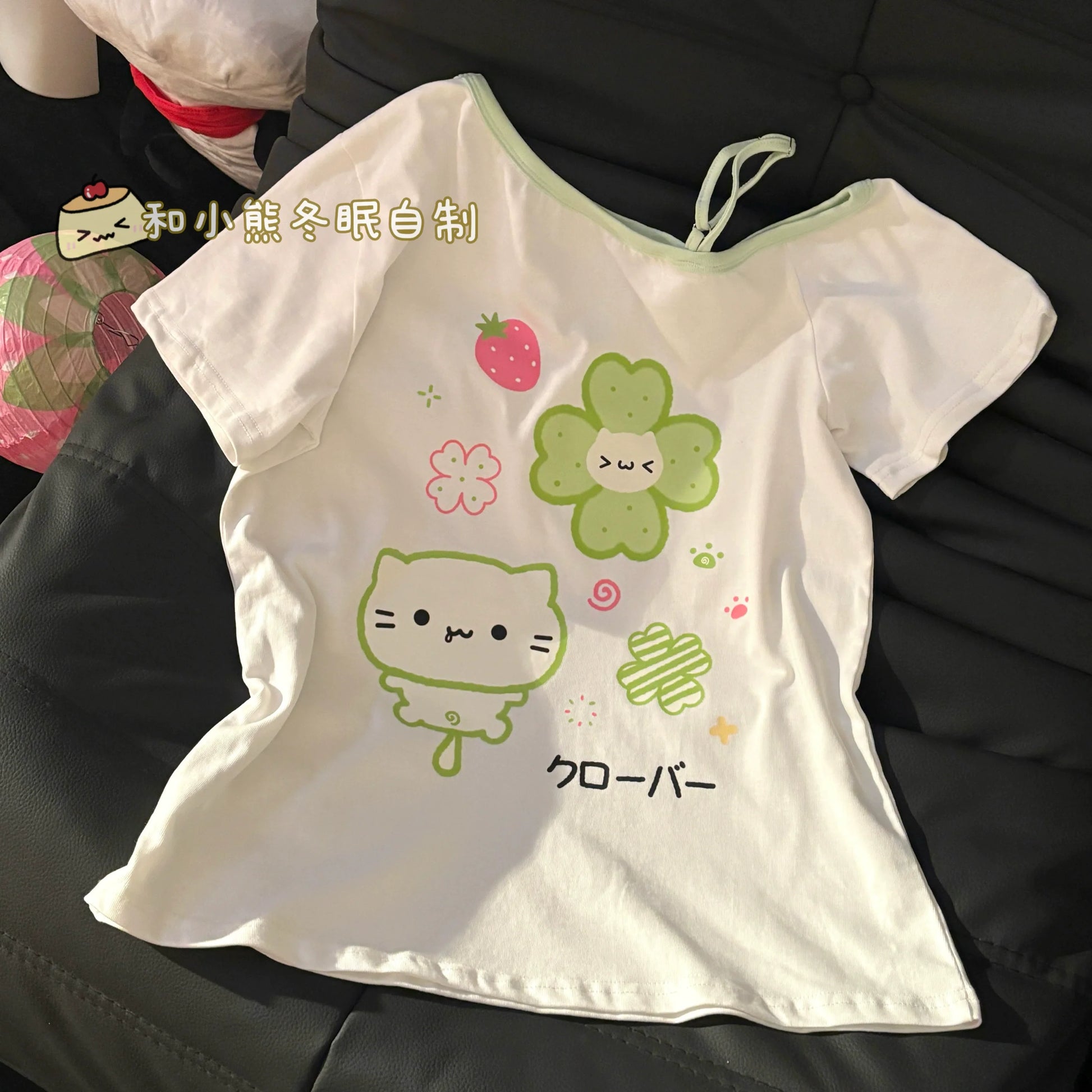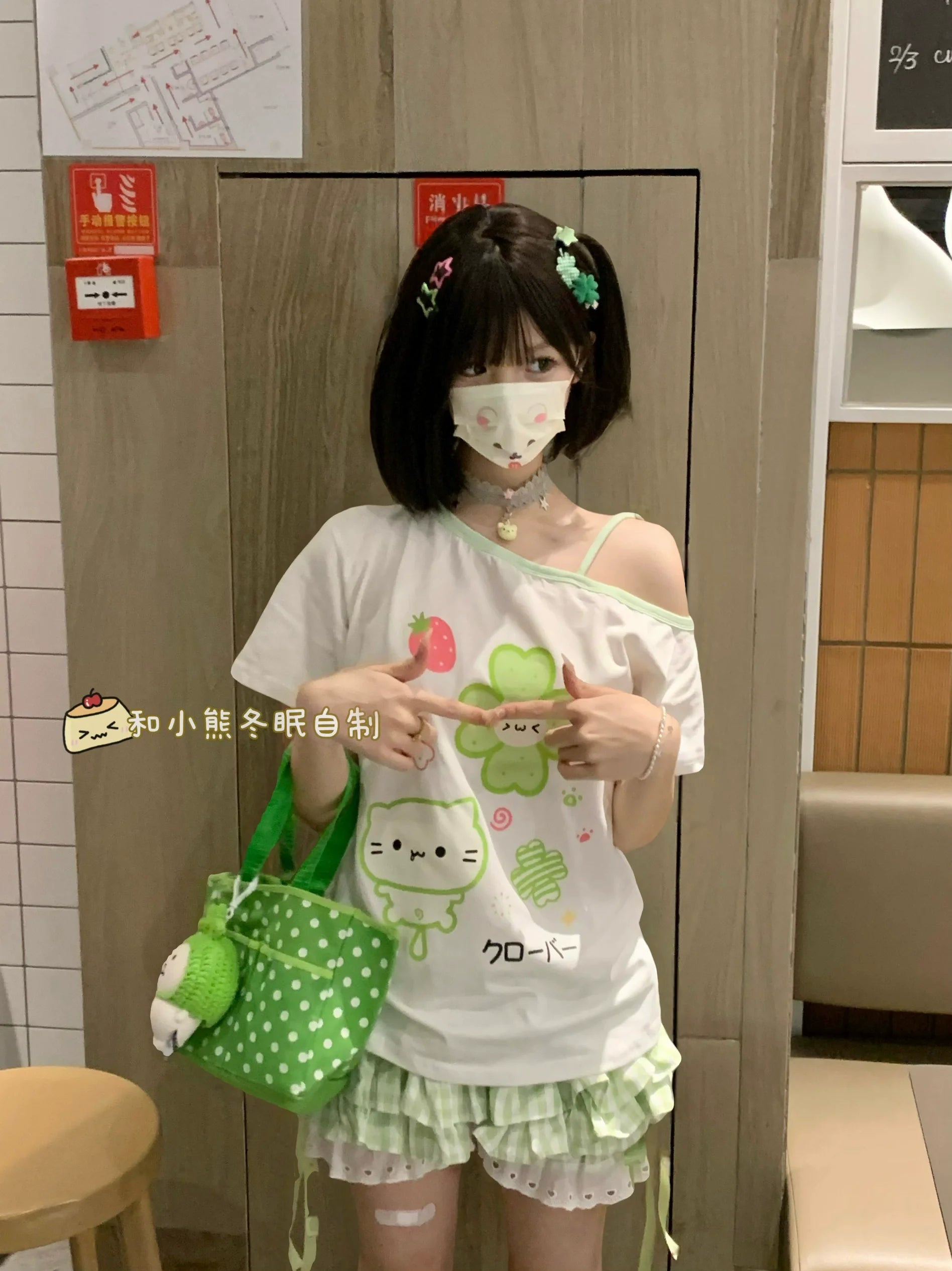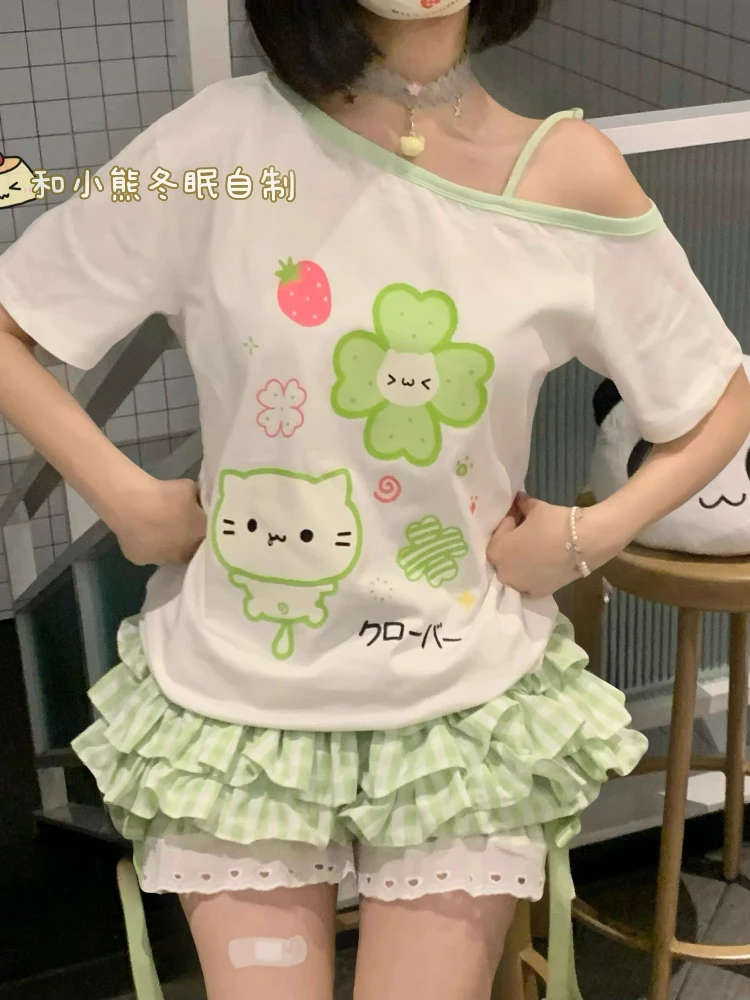 Japanese Kawaii Off Shoulder Tops+Plaid Skirt Set Women Cute Clover Print Tee and Lace Trim Mini Skirt Soft Girl Summer Outfit