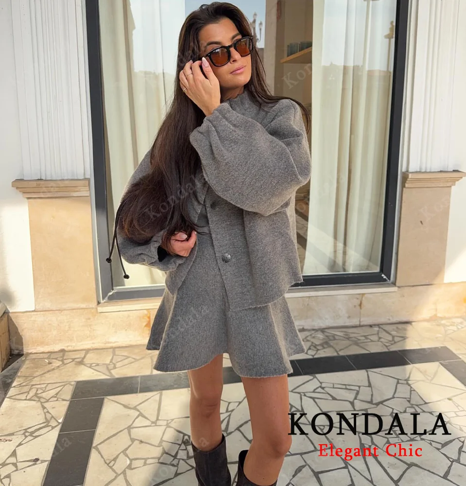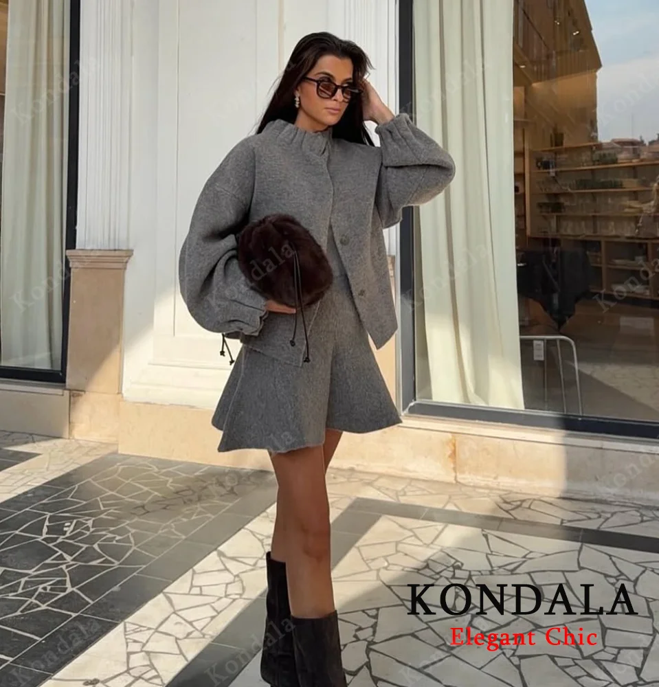KONDALA Ladies Fall Knitted Skirt Set Pleated O-Neck Buttons Jacket, Mini Skirt 2025 Autumn Fashion Elegant Female Skirt Suit