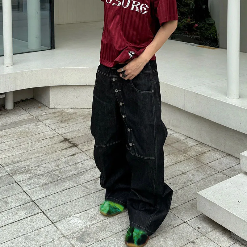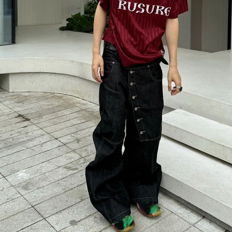 These Korean High Street Buckle Curved Jeans are built for men who want a comfortable, fashion-forward pair for autumn wear. The loose straight silhouette in black offers versatile style that pairs with tees, hoodies, and jackets for everyday street looks.