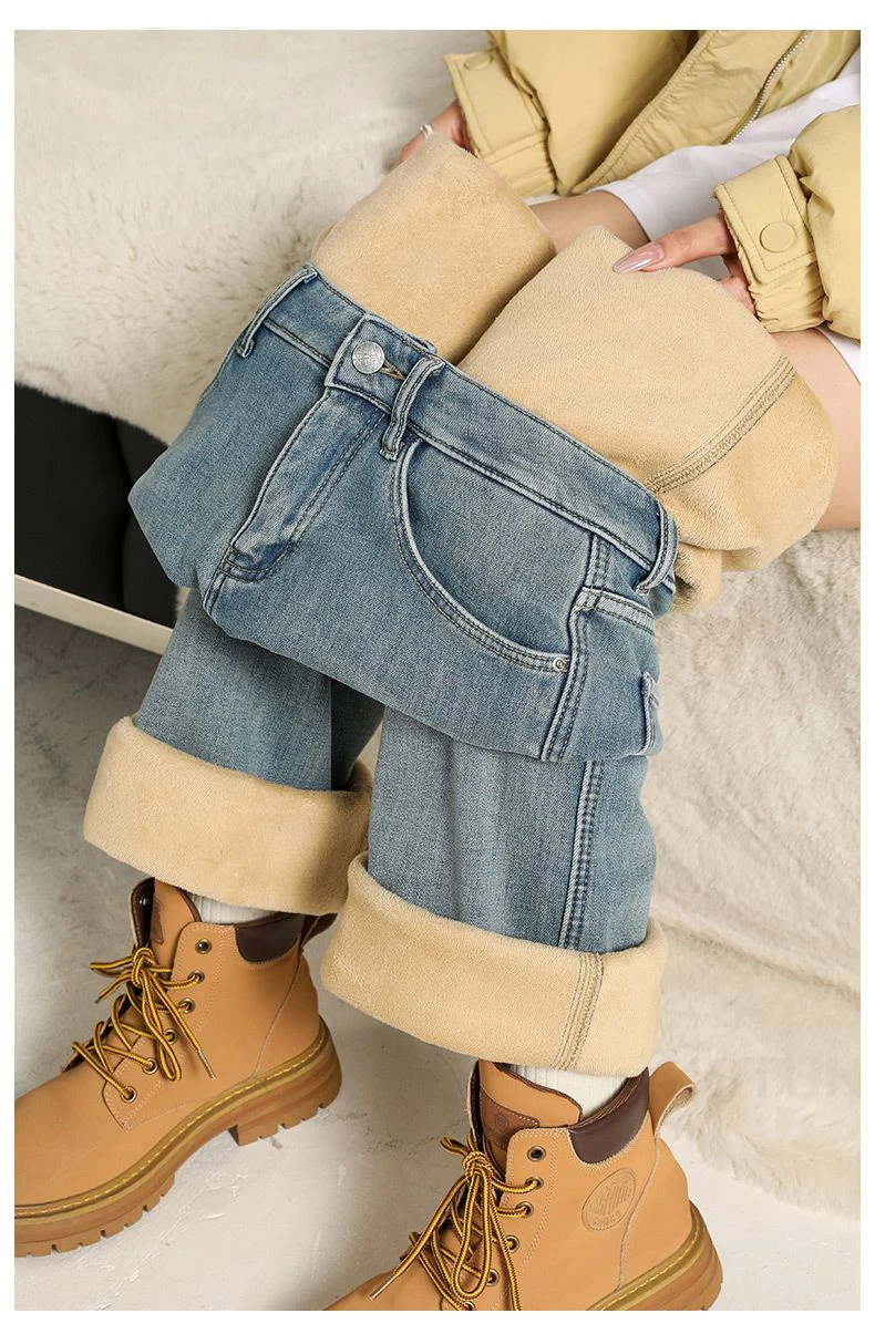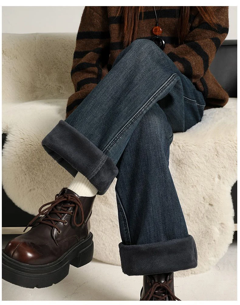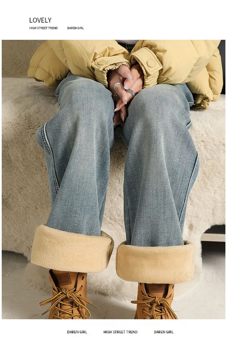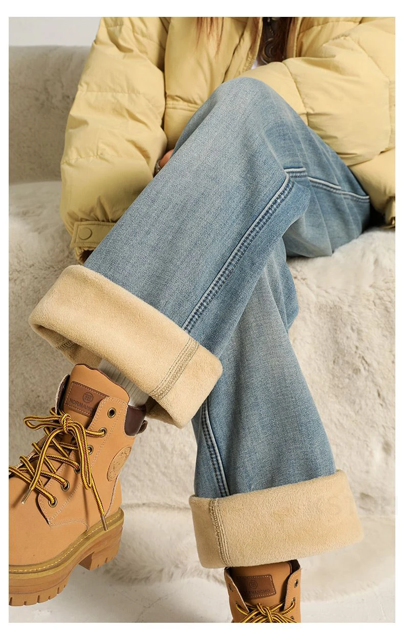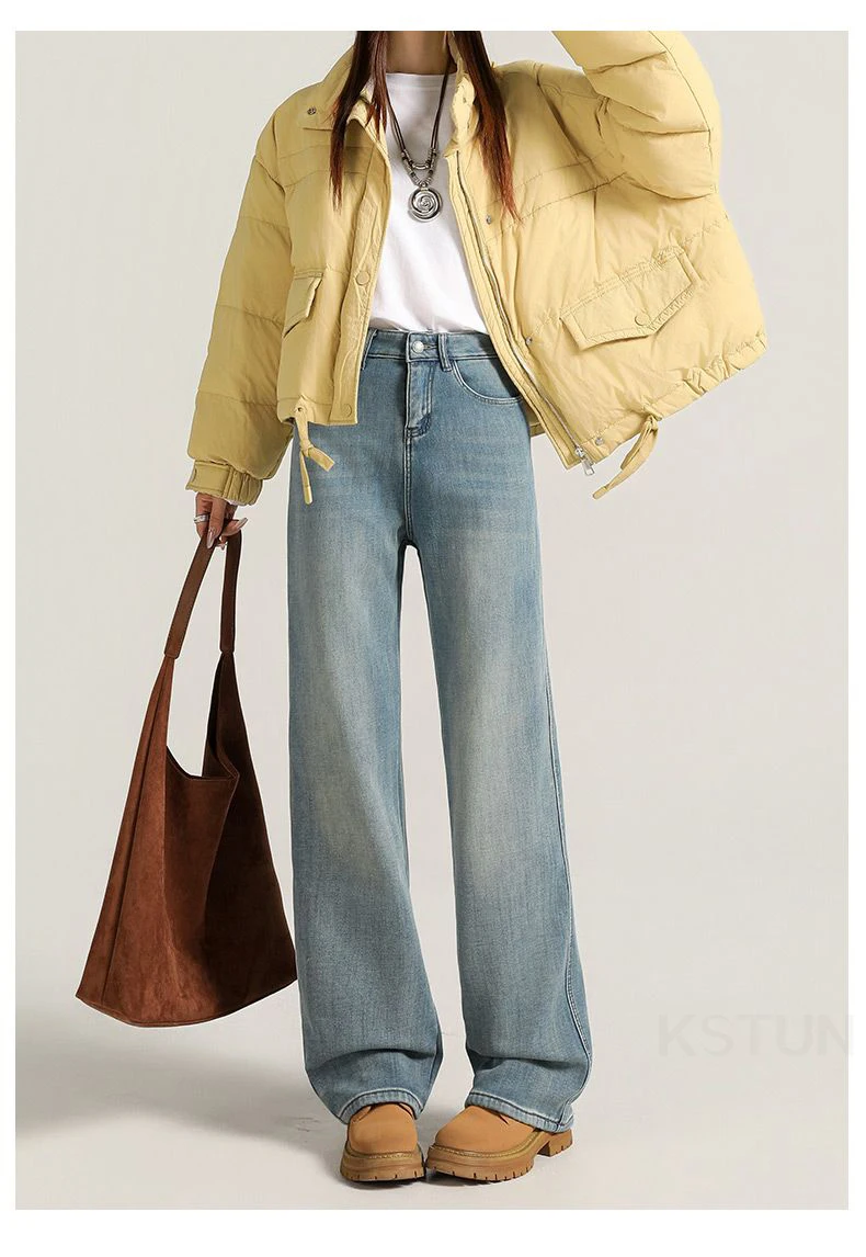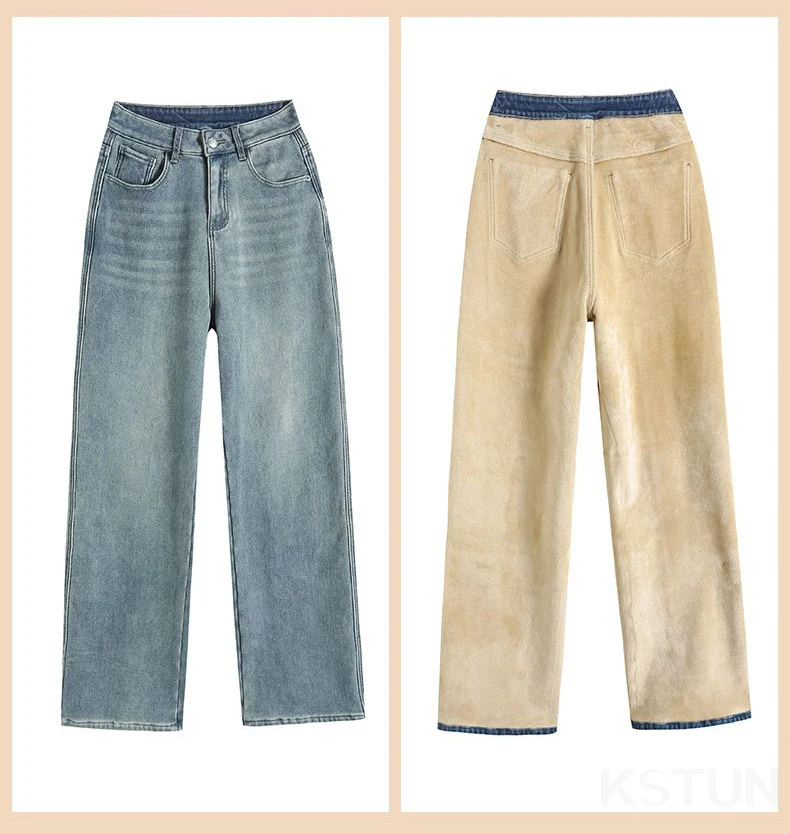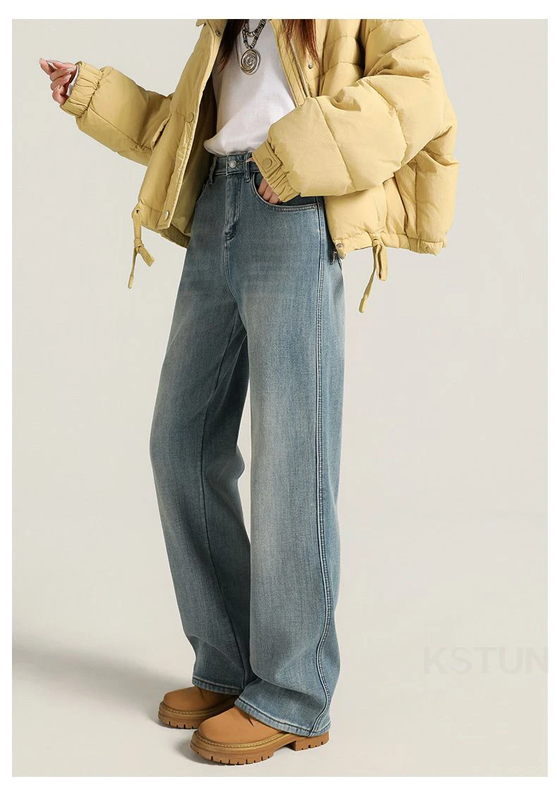 KSTUN Women’s Narrow Cut Wide Leg Jeans with Fleece High Waisted 2025 Winter Warm Jeans For Mom Straight Leg Thicken Trousers