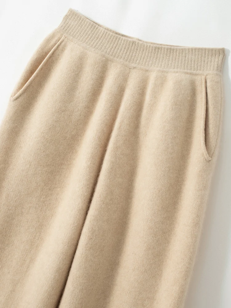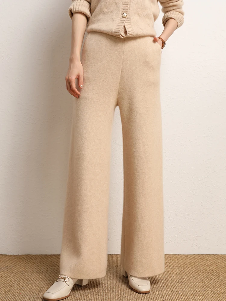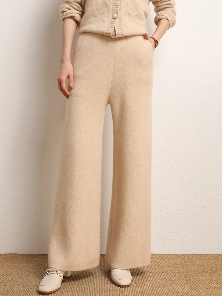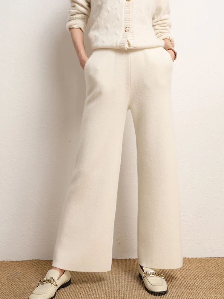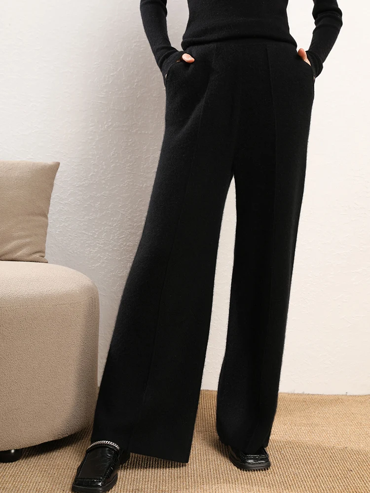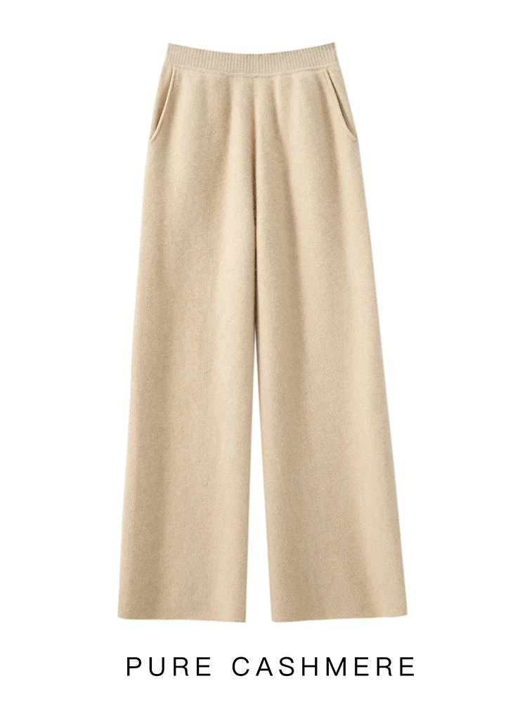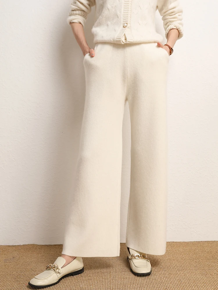 New Chic Women's 100% Cashmere Pants Autumn Winter Wide Leg Pants Simple Style Office Lady Cashmere knitted Trousers Thick Pants