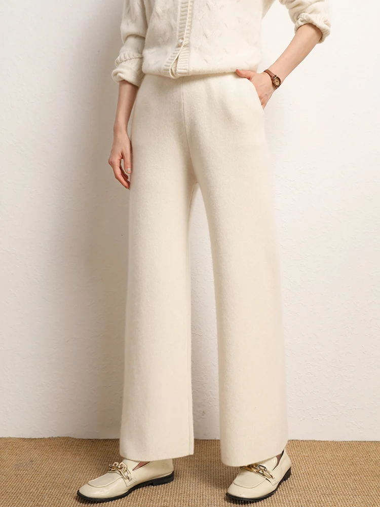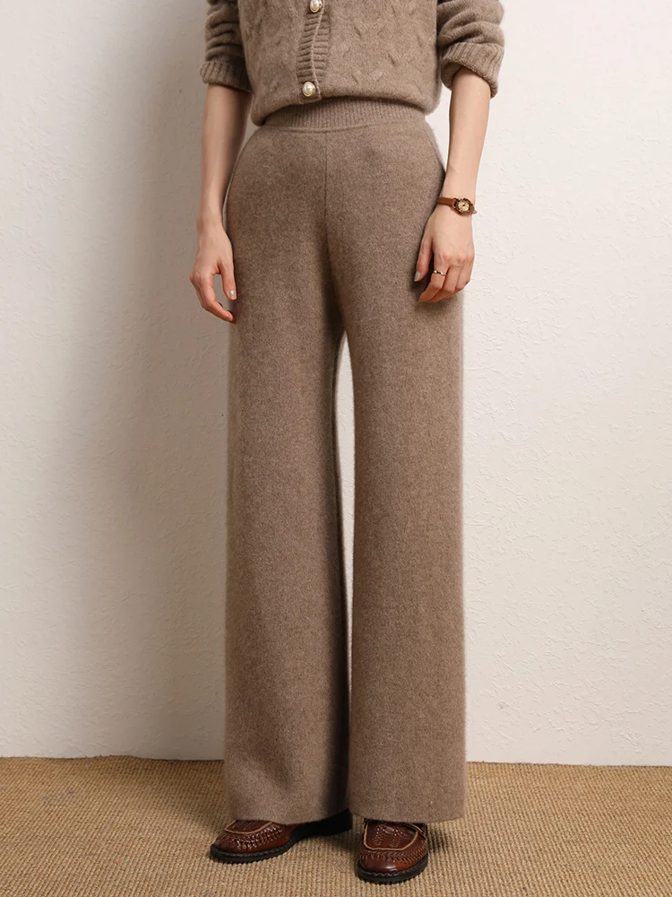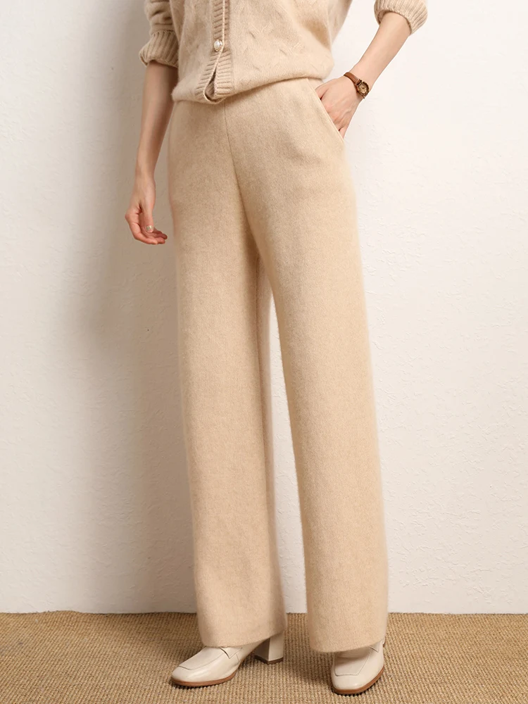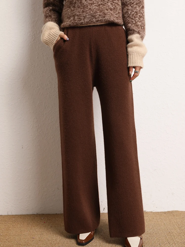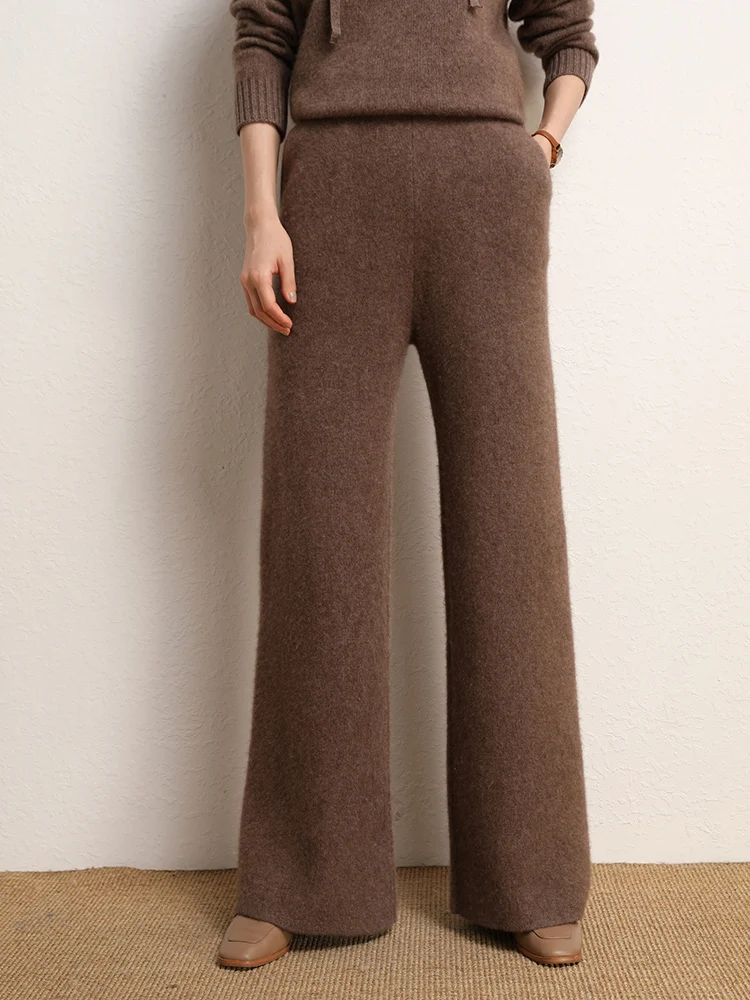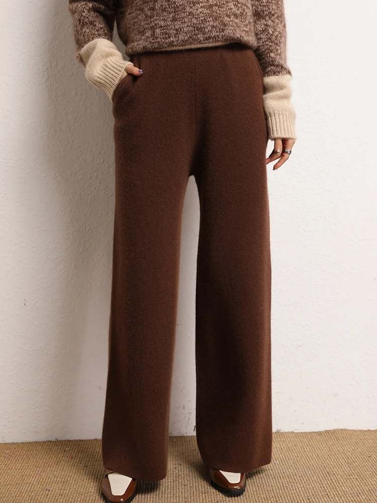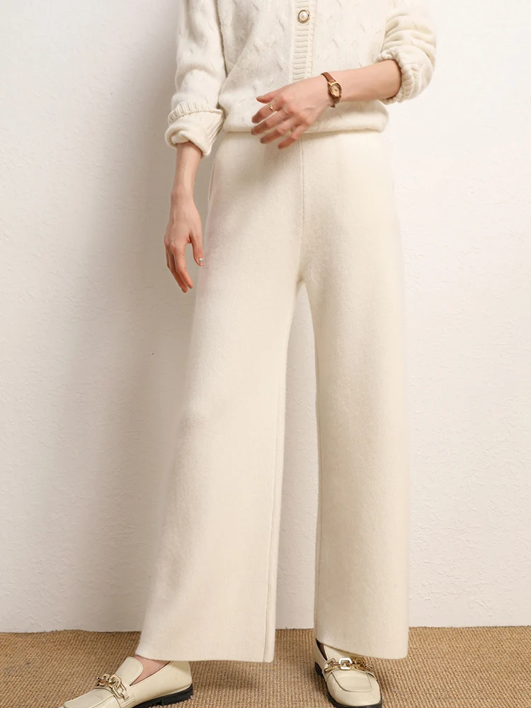 New Chic Women's 100% Cashmere Pants Autumn Winter Wide Leg Pants Simple Style Office Lady Cashmere knitted Trousers Thick Pants
