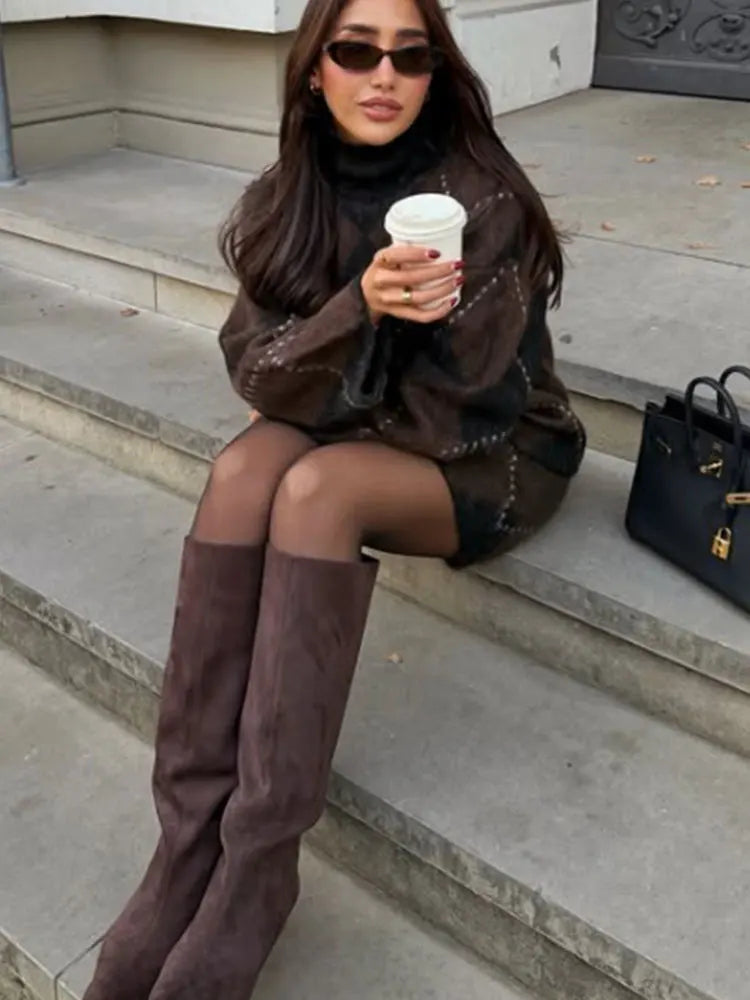 NLZGMSJ Women Knitted Sets 2025 Autumn Winter Wrist Sleeve Slim Plaid Sweater Cardigan Jacket Crop Top Mini Skirt Suits