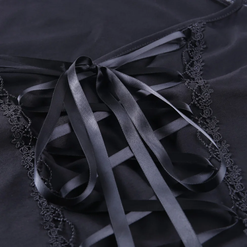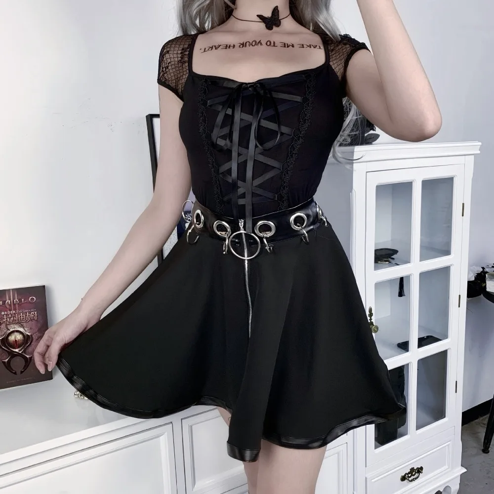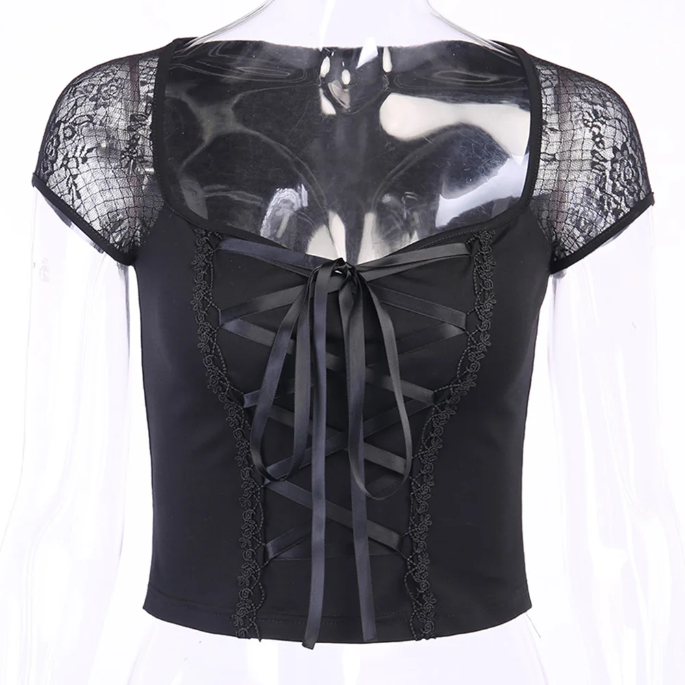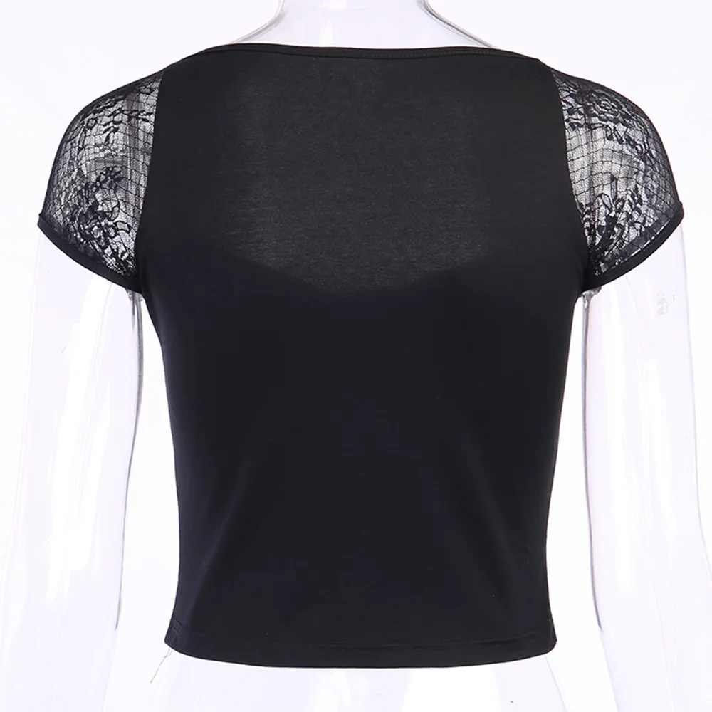 Sexy Street T-shirt Women Lace Patchwork Square Collar Short Sleeve Clothes Gothic Punk Lacing Slim Dark Top Tee Femme