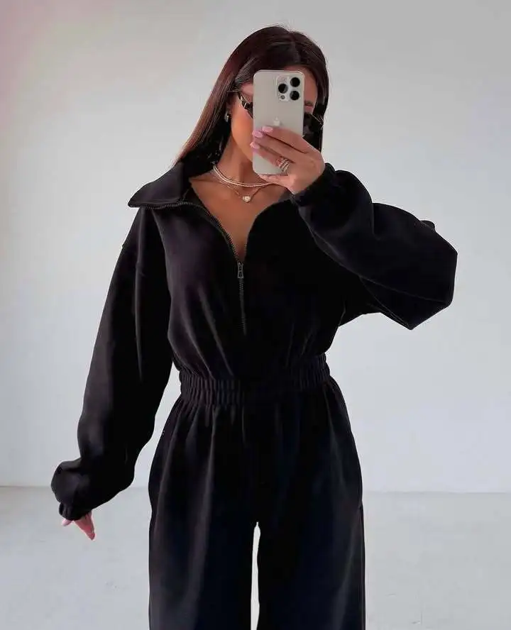 This women’s knit jumpsuit blends comfort with modern streetwear aesthetics, designed for everyday wear in autumn and winter. It offers a clean, versatile silhouette that’s easy to style for any casual occasion.