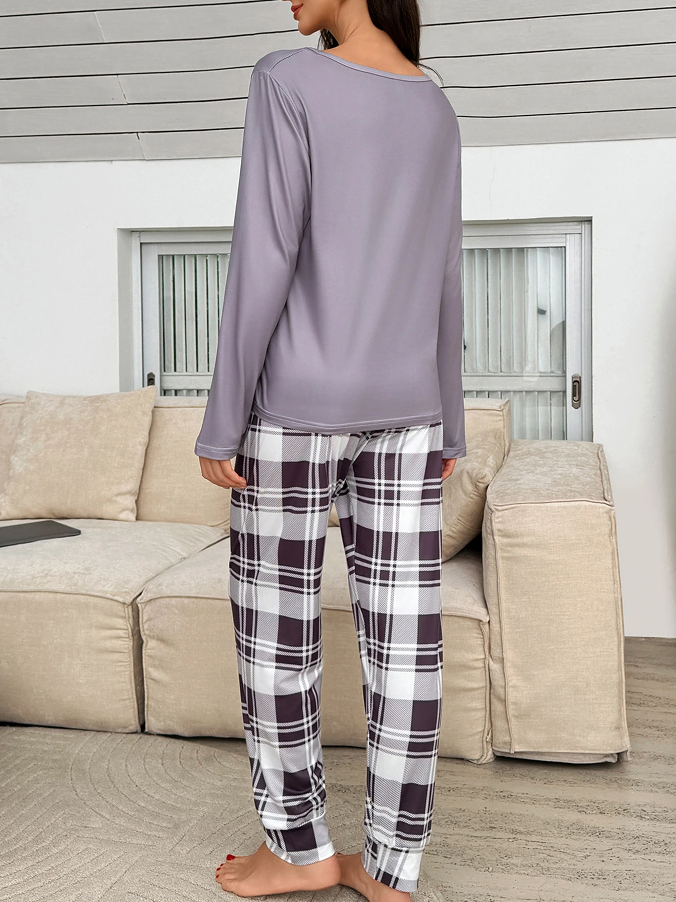 Two-piece set of women's letter-print long-sleeved checked pants for all seasons (spring, summer, autumn, winter) for home wear