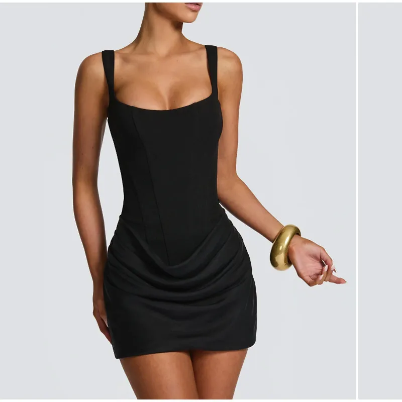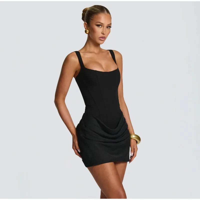 Women Coffee Pleated Sling Evening Mini Dresses Fashion Sleeveless High Waist U Neck Slim Short Dress Lady Highstreet Party Robe