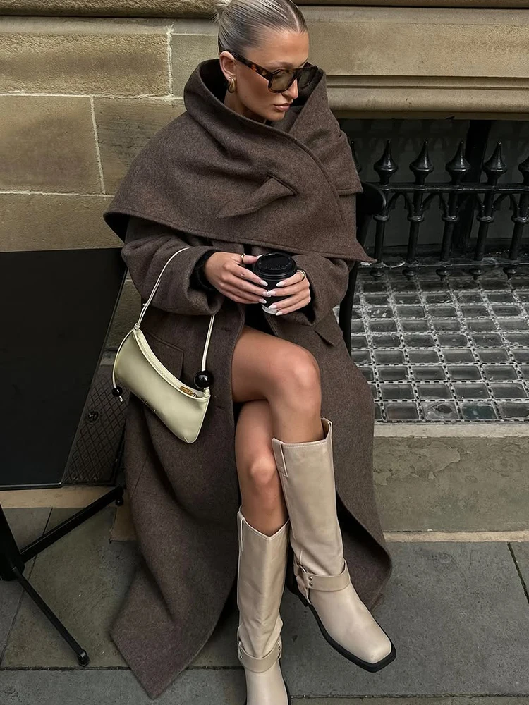 Women Elegant Shoulder Pad Wool Blend Overcoat Brown Lapel Single-breasted Long Sleeve Coat 2025 Autumn Lady Commuter Outerwear