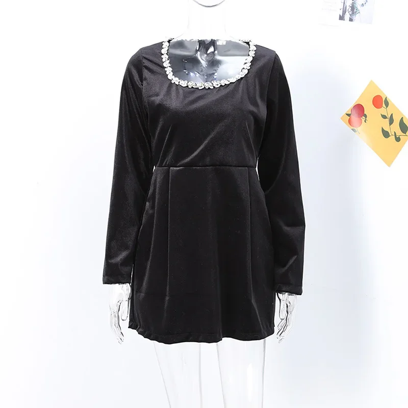 Women Long Sleeve Square Collar Beading Velvet Dress High Waist Slim A-line Party Dresses Ladies Evening Gowns