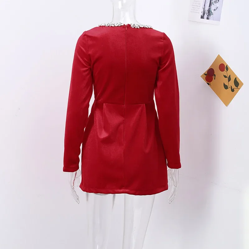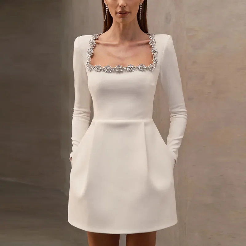 Elegant and versatile, this polyester dress blends a square neckline, empire waist, and diamond-beaded details for a refined evening look. Available in white, black, or red, it’s designed for women seeking a slim A-line silhouette with a chic pull-on style for autumn and winter events.