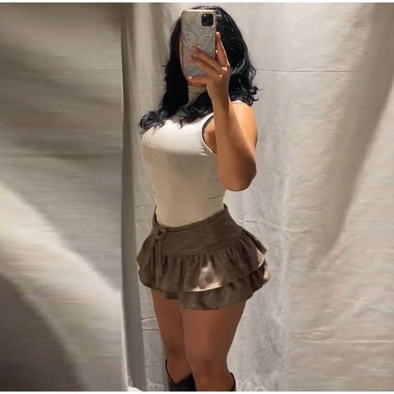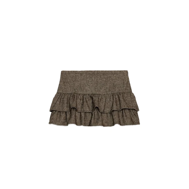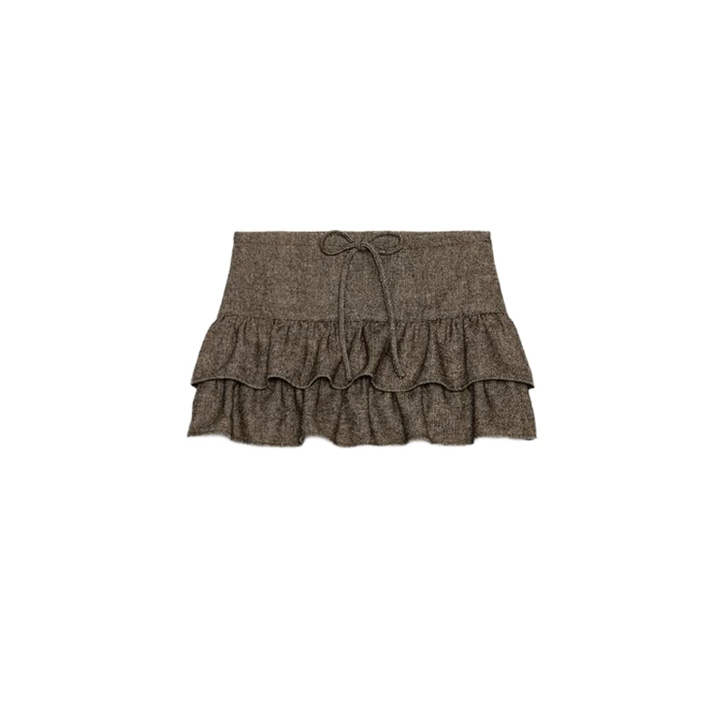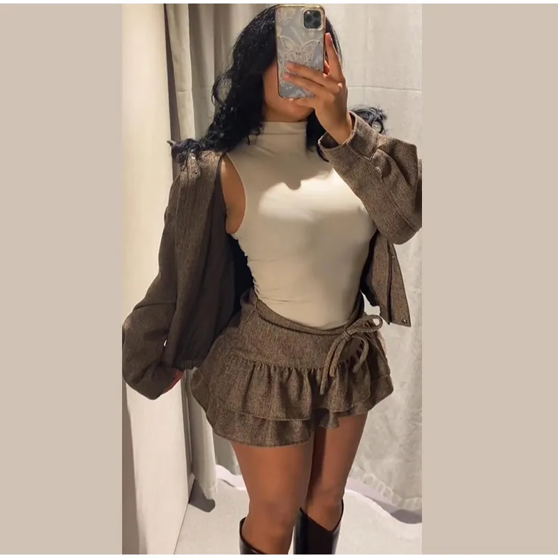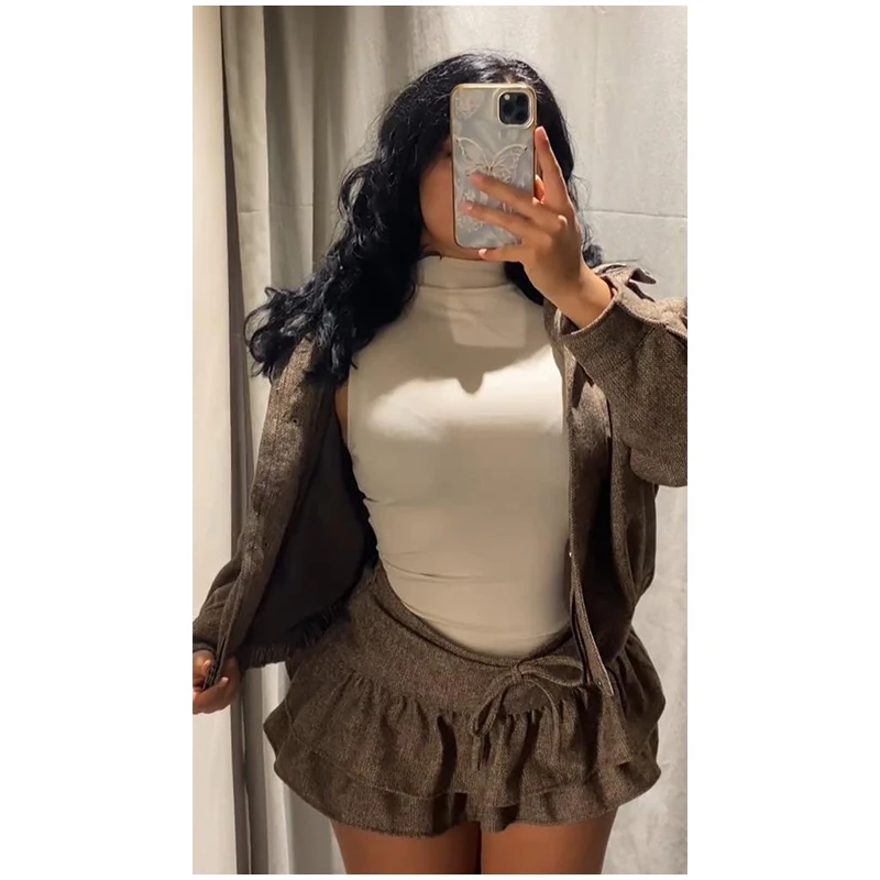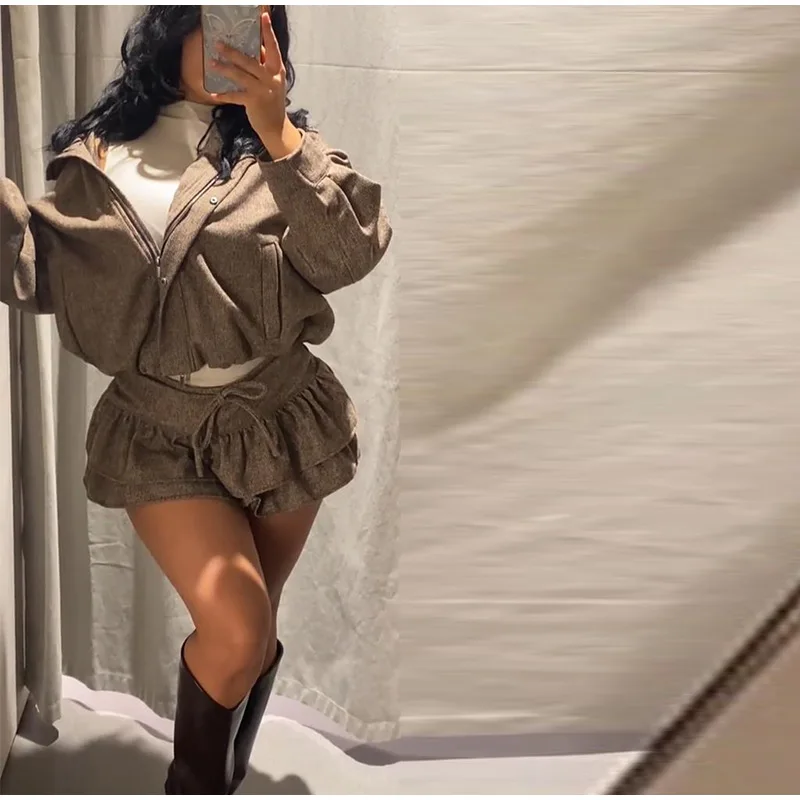Women's Brown Skirt Jacket Set Stand Collar Bomber Jacket Coat Matching Ruffled Skirts Vintage Casual Outfit Autumn Streetwear