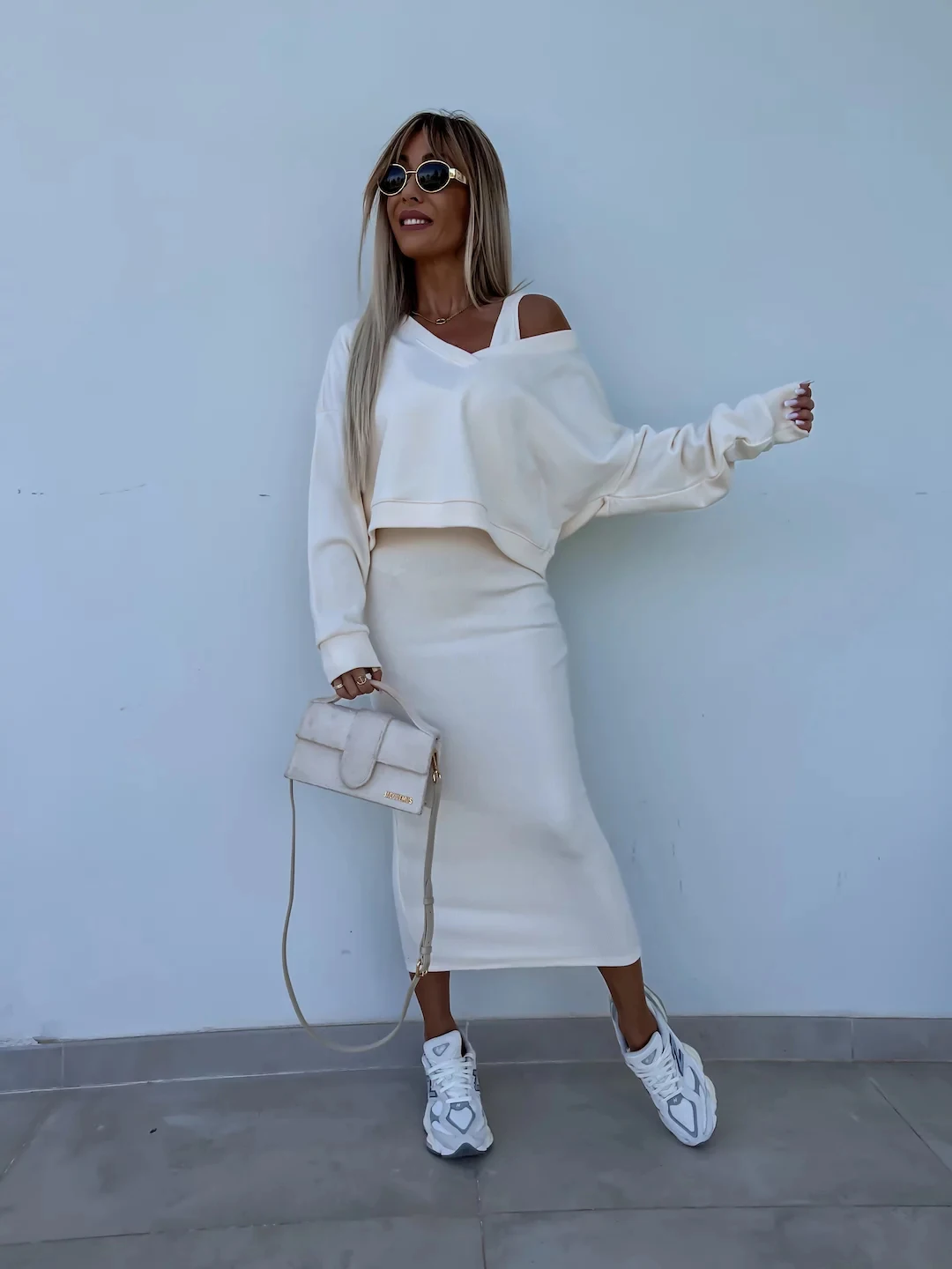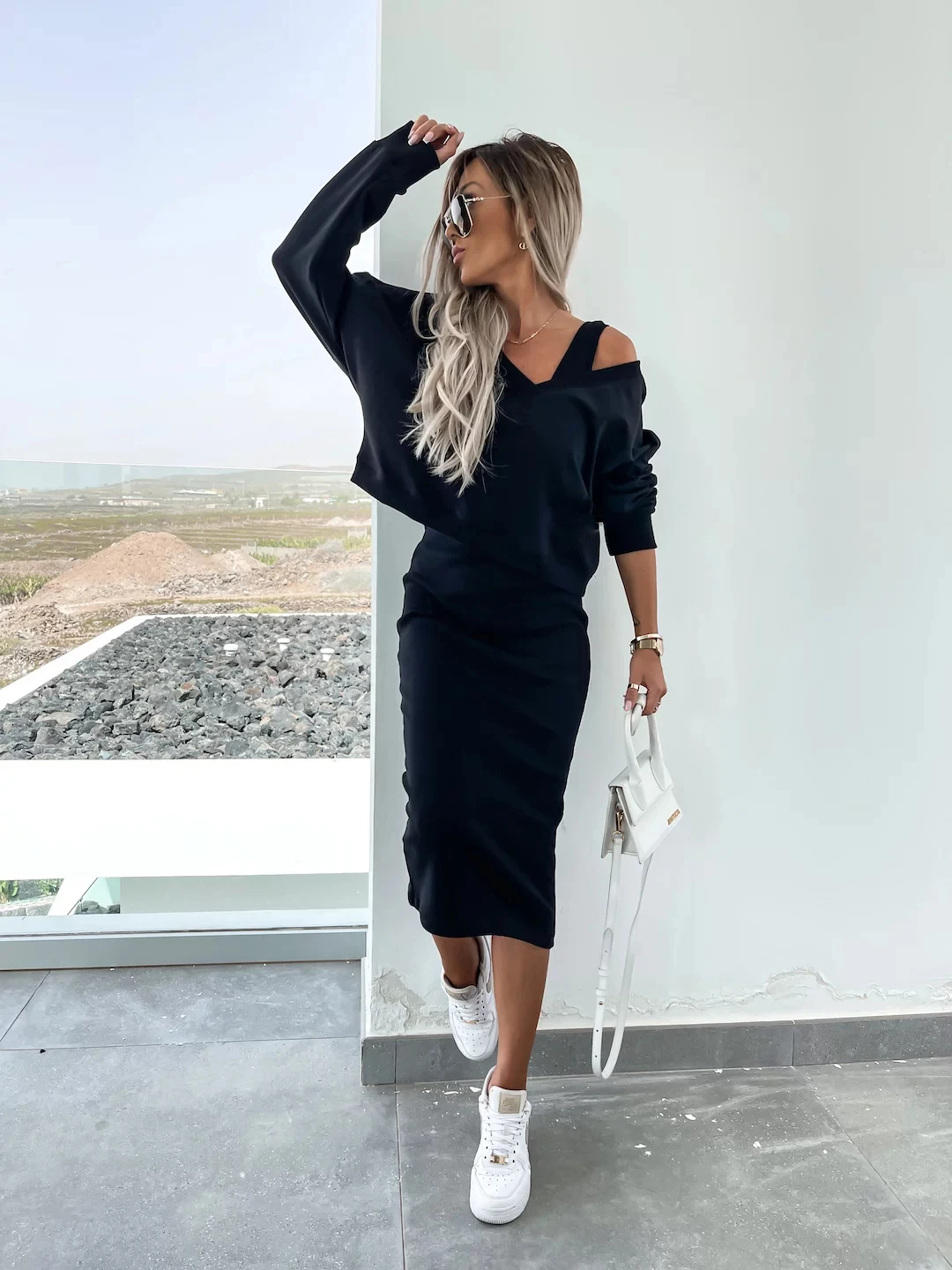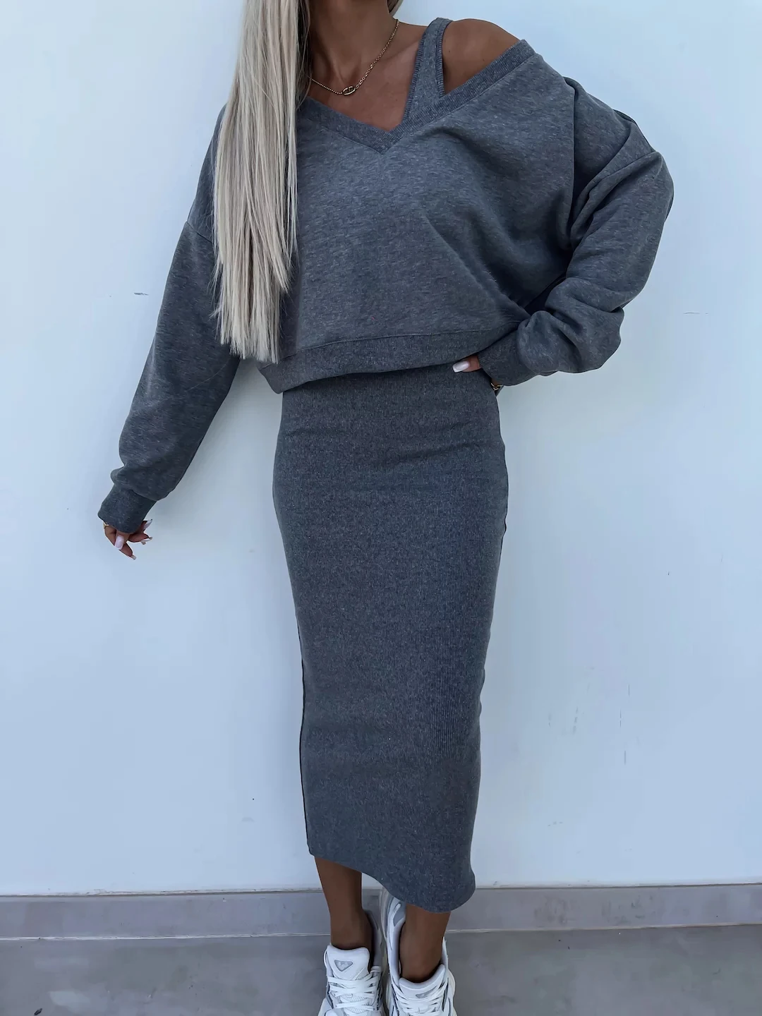 - Two-piece set: loose-knit pullover hoodie top + slim-fit mid-calf dress in a cohesive, solid color.