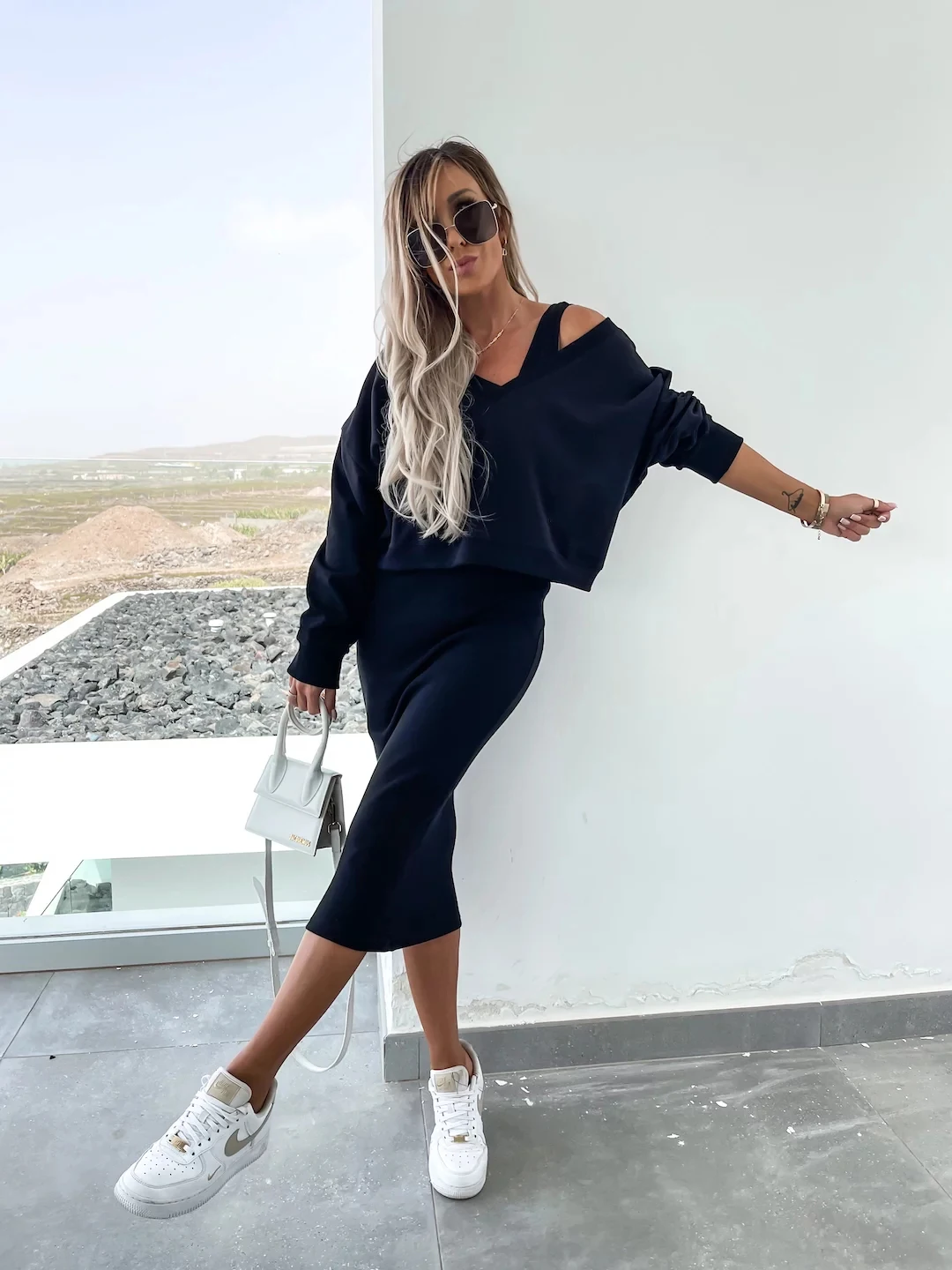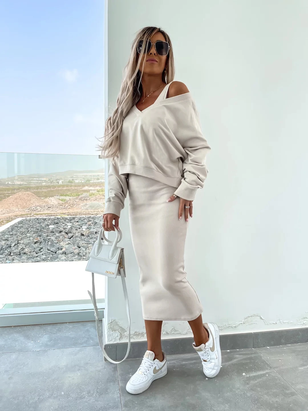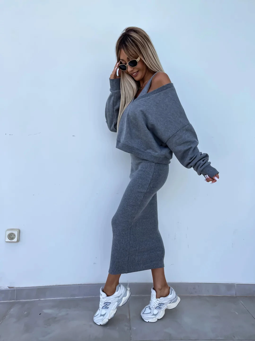 - Two-piece set: loose-knit pullover hoodie top + slim-fit mid-calf dress in a cohesive, solid color.