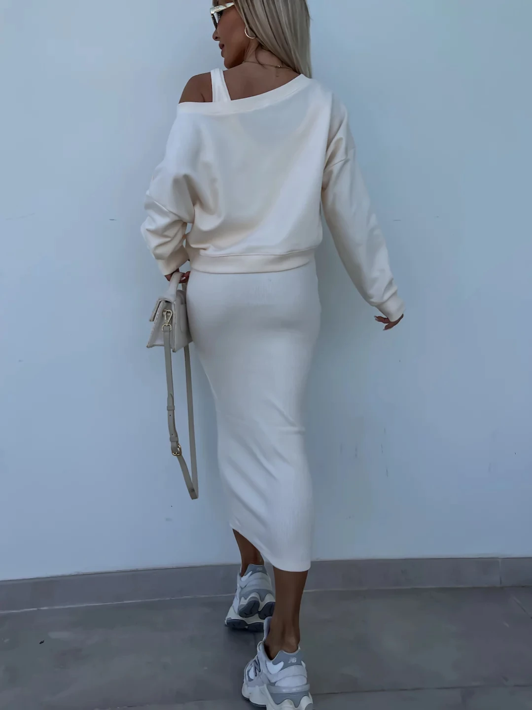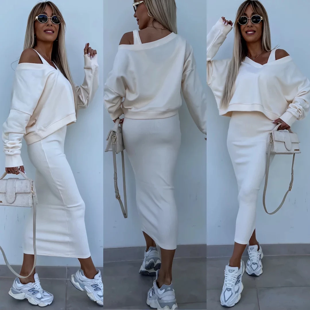 A versatile two-piece knit set designed for modern women who value comfort, ease, and a clean, polished look. This solid-color duo pairs a loose, long-sleeve pullover hoodie with a slim-fit dress for all-season wear.