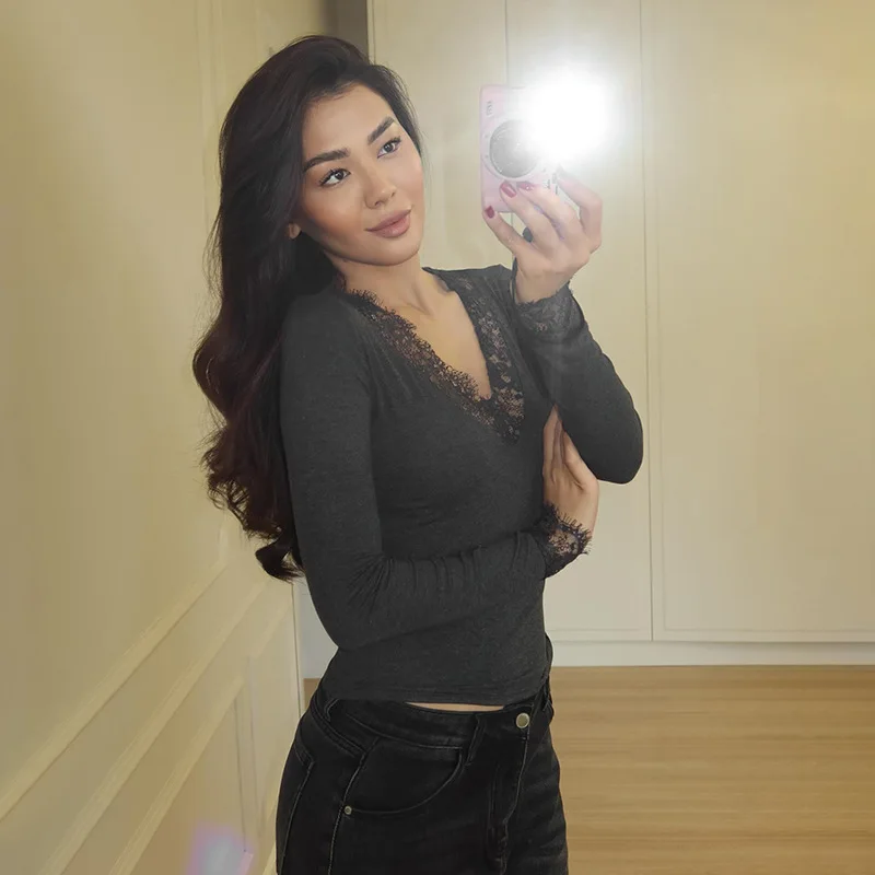 - Neckline: V-neck with delicate lace trim for a feminine, elegant touch