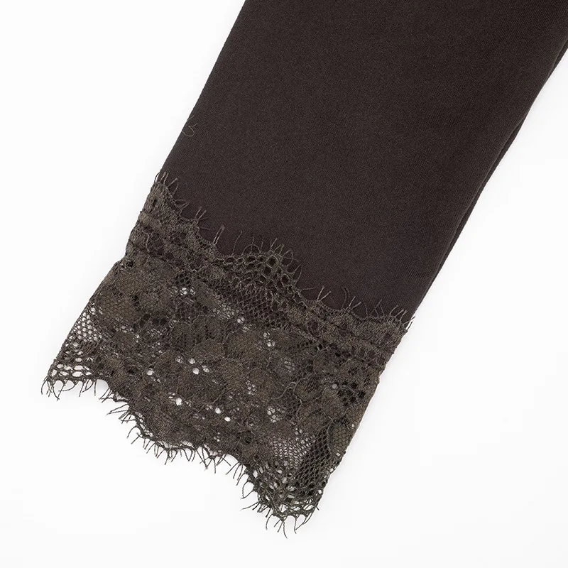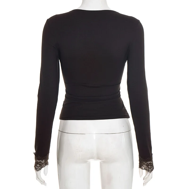 Women's V-neck Lace Trim Splice Waist-cinching Belly-baring Top Trendy Street Style Long Sleeve Polyester Spandex T-shirt