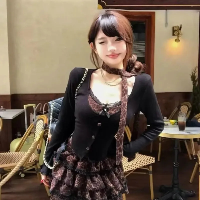 Y2k Sexy Retro Punk Set Women New Suit Scarf Long Sleeve Top High Waist Slimming Cake Skirts Two-piece Set